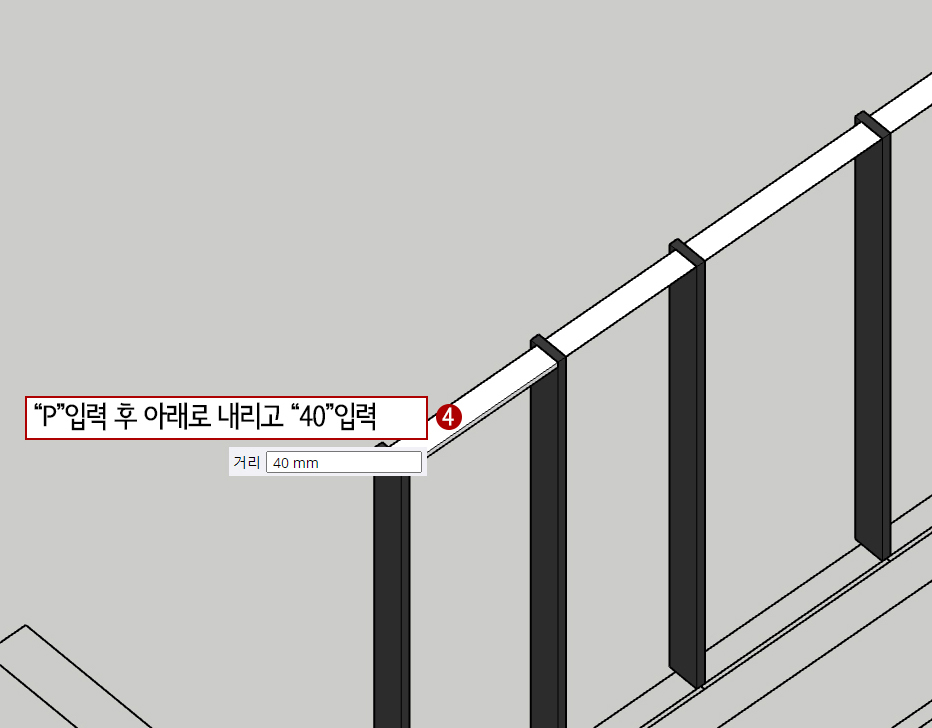 4. P(Push/Pull) 누른 후 오른쪽 사각형 윗면을 아래로 당겨서 키보드에서 "40"을 입력해 줍니다.(두께 40mm)