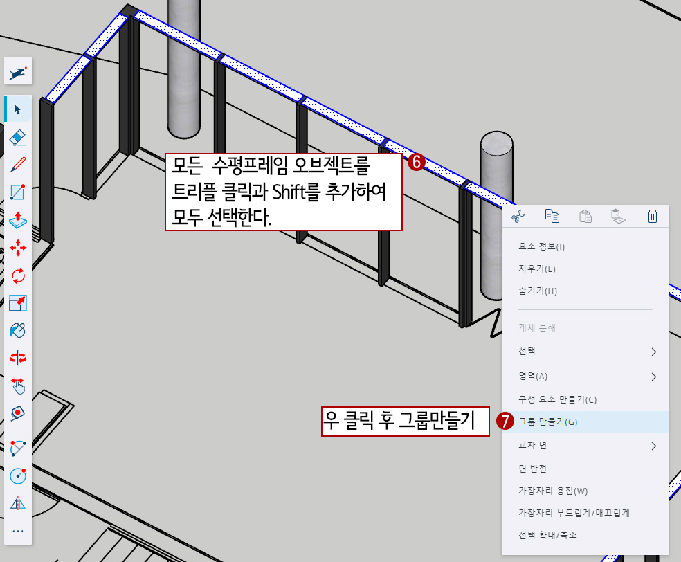 방금 만든 프레임은 여러 개 복사가 될 것인데, 만약 동일한 높이로 수정을 해야 할 경우가 있을 것입니다. 그런 경우가 생길 것으로 예상된다면 그룹을 시키지 말고, 구성 요소(Component)로 만드는 것이 좋을 것입니다.