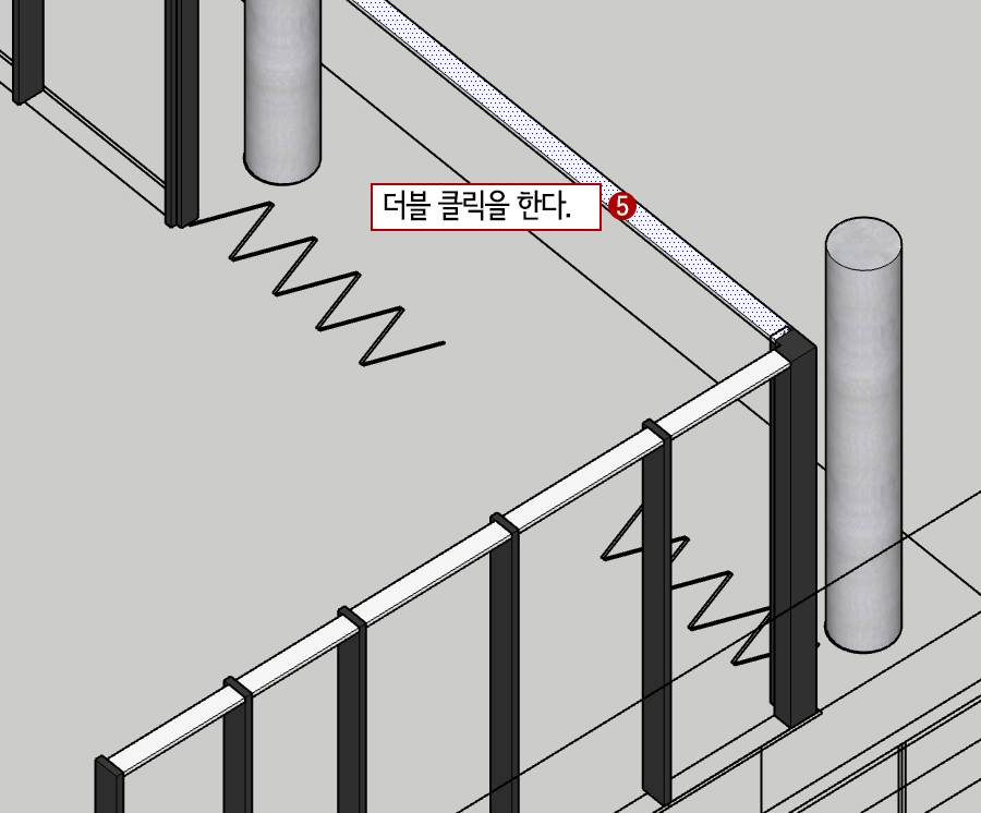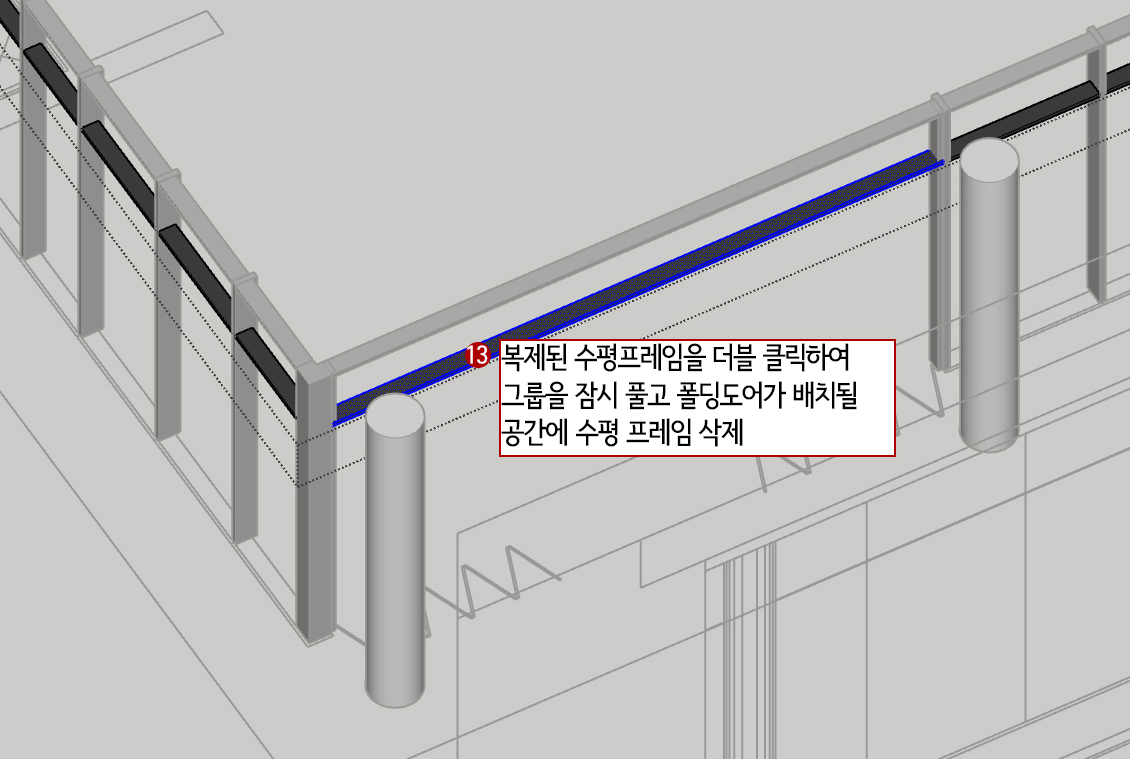 13. 복제된 수평프레임을 더블 클릭하여 잠시 열어줍니다. 폴딩도어가 배치 될 공간에 수평 프레임 부분을 트리플 클릭하여 Delete 시켜 줍니다.
