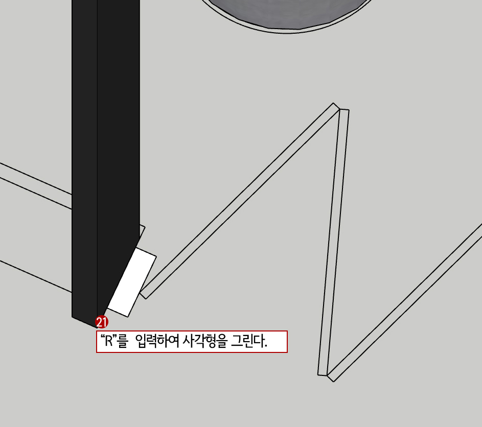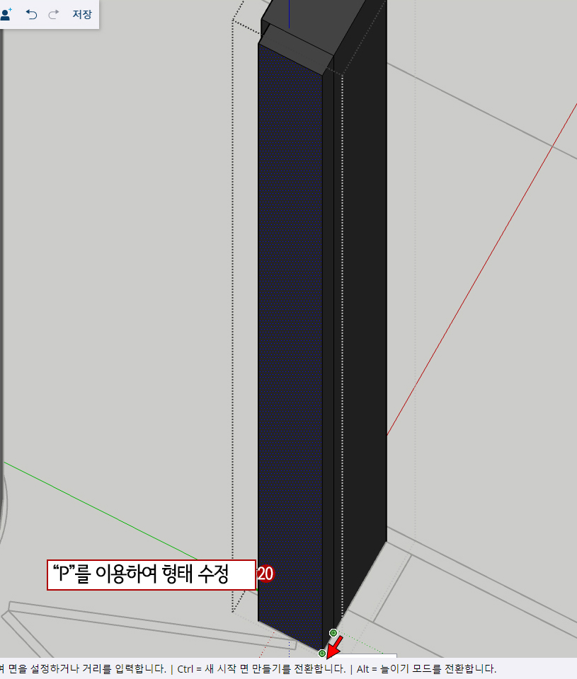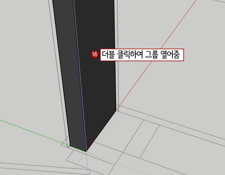 그런데 코너 부분 두 군데는 형태가 다릅니다. 그냥 라인으로 평면을 그려서 push/pull해도 되지만, Component 된 물체를 변형하는 방법을 배우고자 방법을 소개합니다.
