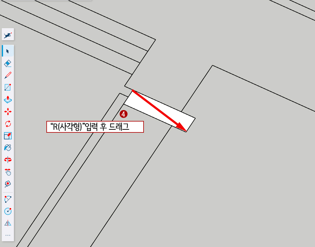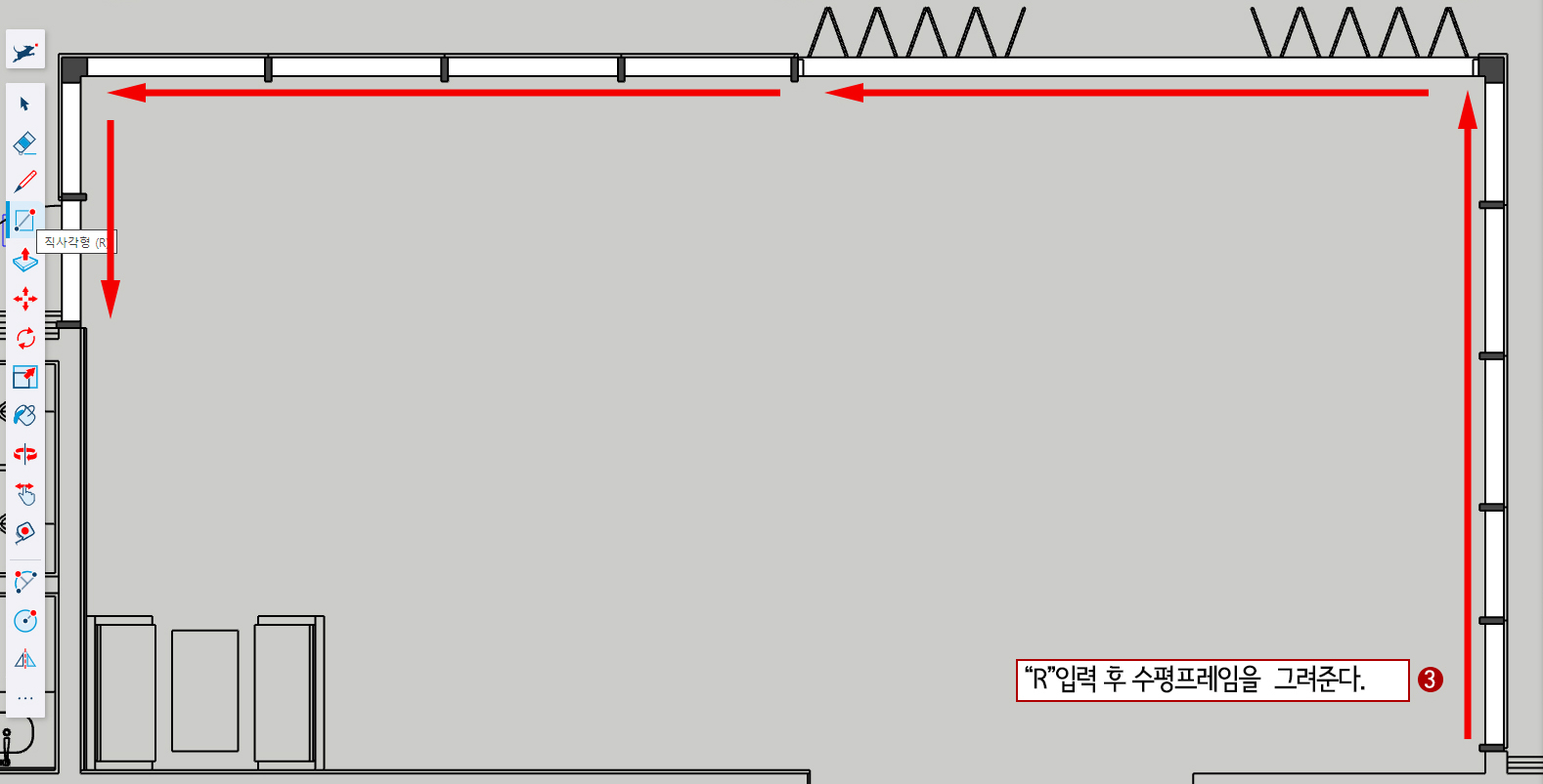 4. R(사각형)을 눌러주고 도면에 맞게 드래그하여 프레임을 그려 줍니다.