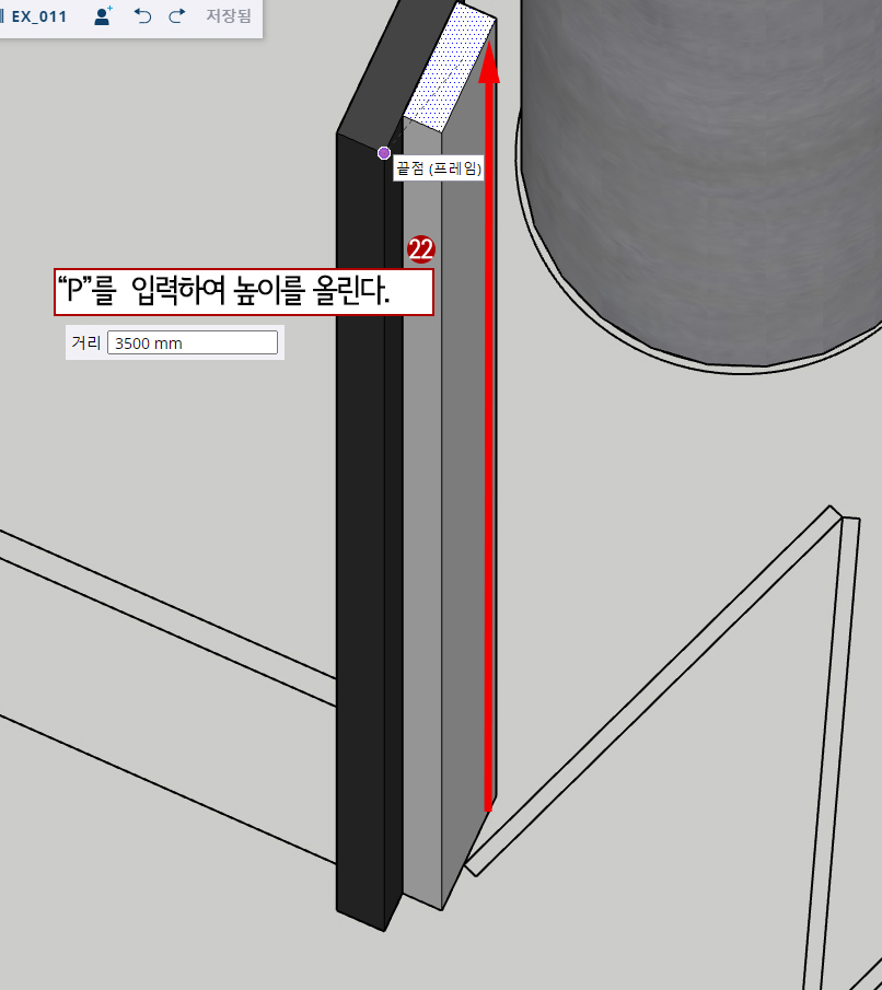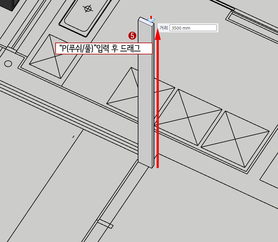 5. P(Push/Pull)을 눌러주고 윗면을 끌어올려준 뒤 키보드로 "3500"을 입력하여 높이를 3,500mm로 해줍니다.