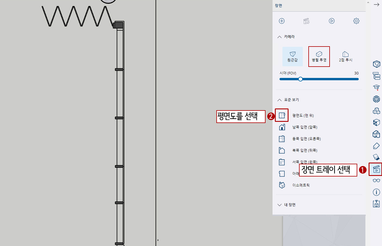 2. 평면도(맨 위)뷰를 선택합니다.(병렬 투영으로 해서 투시를 없애주세요.)