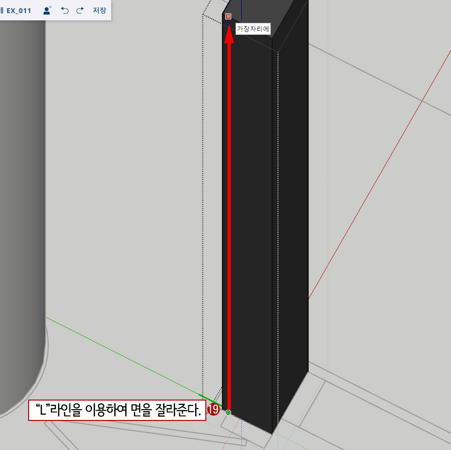 19. L(선)을 누르고 그림처럼 앞면 아래 끝점에서 클릭하고 위 끝점으로 수직방향으로 선을 그려줍니다. 면이 분할됩니다.