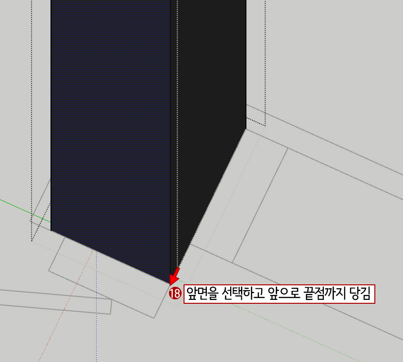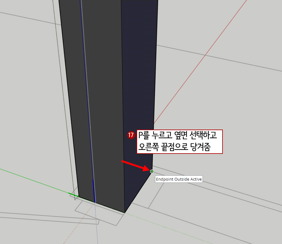 17. 프레임크기가 도면과 다를 것입니다. 우선 P(Push/pull)를 눌러 측면을 선택하고 오른쪽으로 땅겨줍니다. 이때 그림처럼 끝점에 스냅을 걸어서 형태를 맞춰 줍니다.