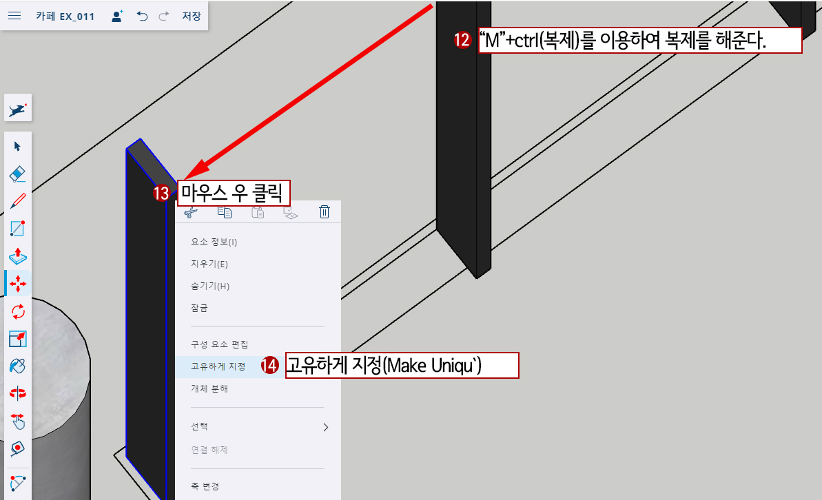 14. 고유하게 지정(Make Unique)을 해서 원본과 다른 게 속성을 변형해 주는 겁니다.
