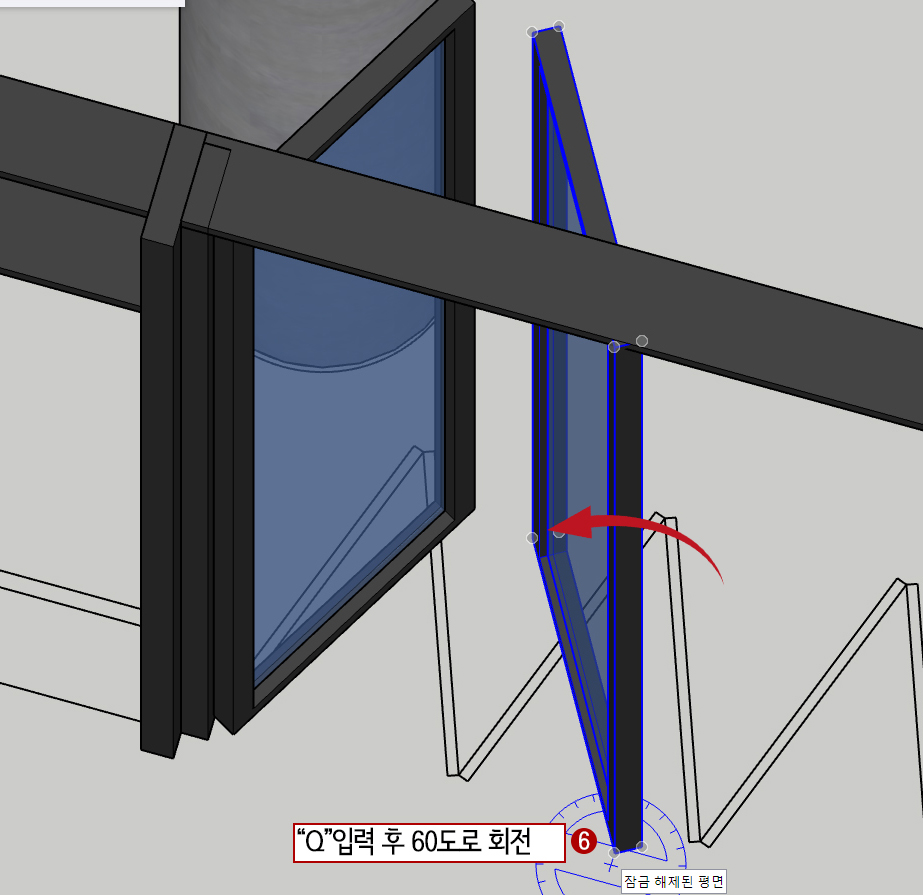 3. Q(회전)을 누른 후 Z 축을 기준으로 시계반대 방향으로 60도 돌려줍니다.
