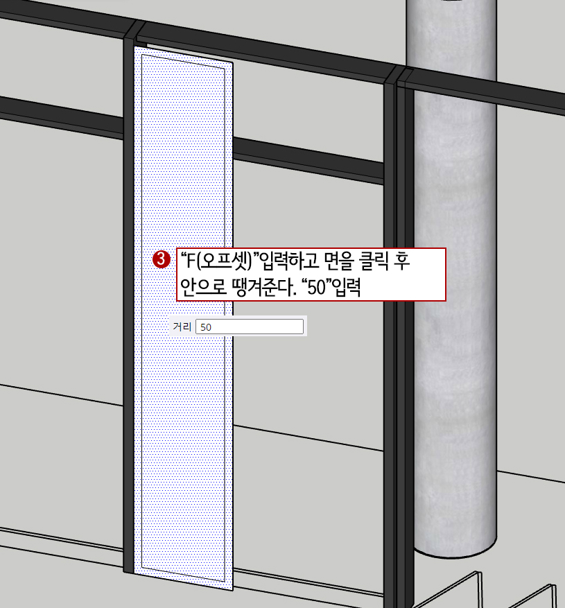 3. F(Offset)을 누르고 면을 클릭 후 안으로 당겨준 뒤 "50"입력합니다.(오프셋으로 폴딩도어 프레임을 만들어 줍니다.)