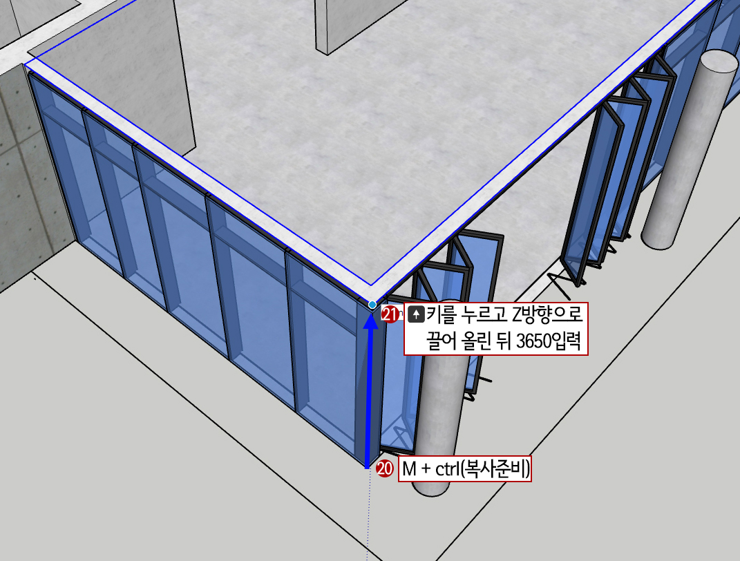 21. 윗방향 화살표 ↑ 를 눌러줍니다.(Z방향 고정) 위로 복제하여 줍니다. 키보드에서 '3650'을 입력합니다.