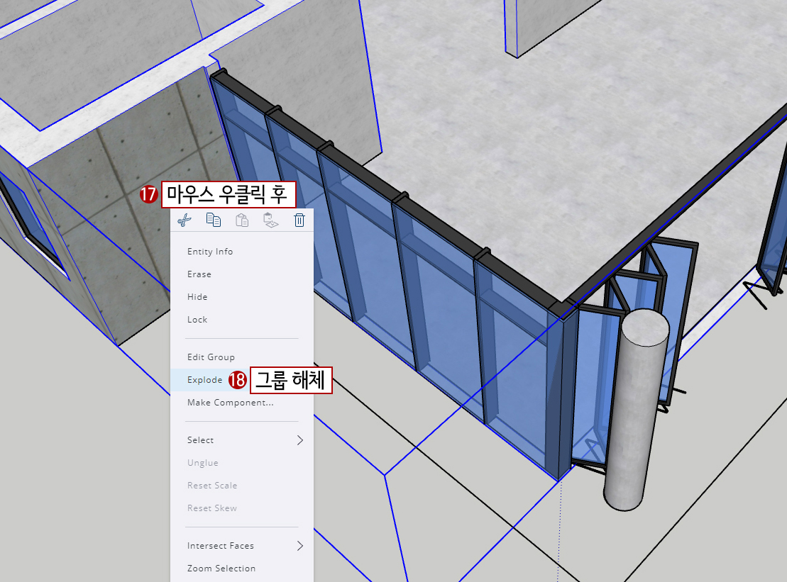 3. Space Bar를 누른 후 유리창 오프젝트를 트리플 클릭하여 선택하고
