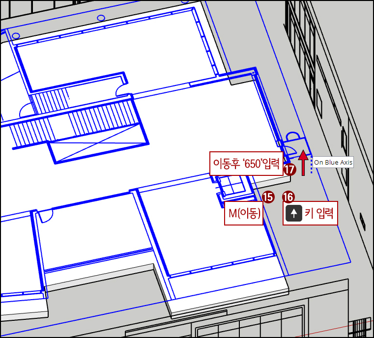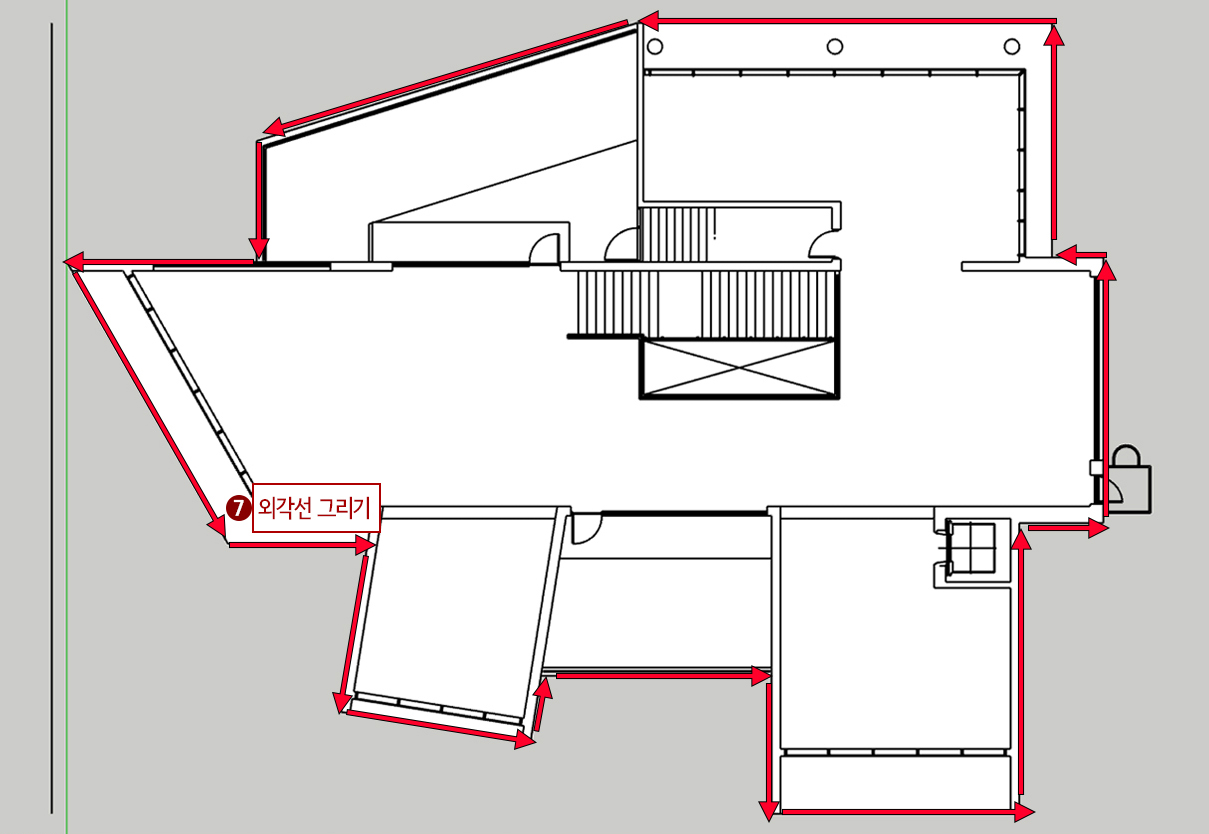 24. 옥상층 올라가는 계단실 아래는 그림처럼 일부 선이 내부선을 따라 그려야 하는 부분도 있습니다. 참조해 주세요.