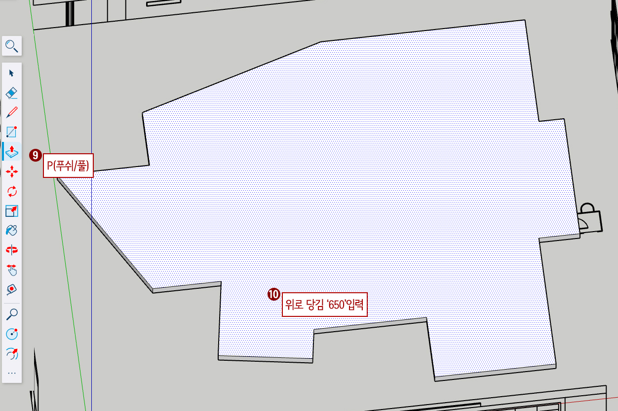 10. 윗면을 클릭하여 위로 당겨서 키보드로 '650'을 입력합니다.(두께 650mm)