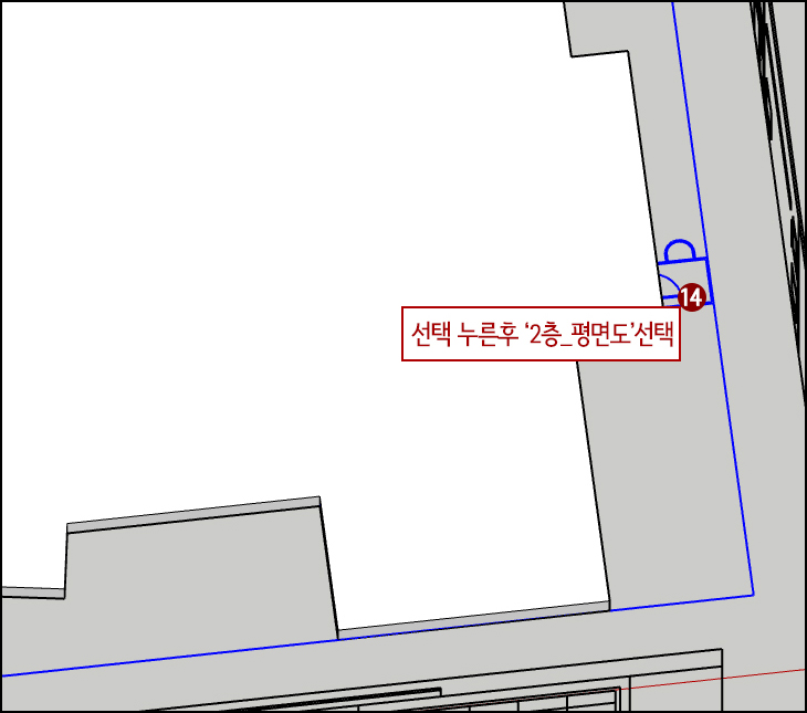 25. SpaceBar를 누른 후 그림처럼 출입구 부분에 라인을 선택합니다.(2층_평면도 태그는 숨깁니다.)