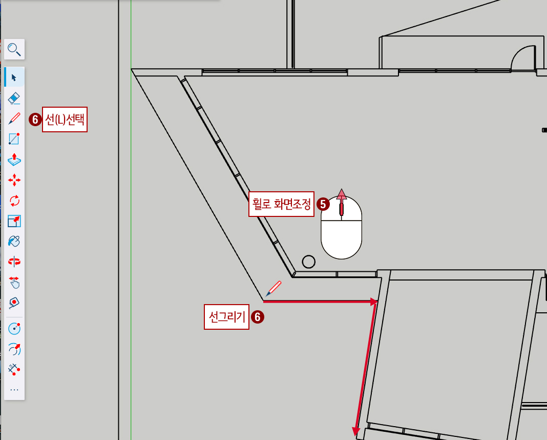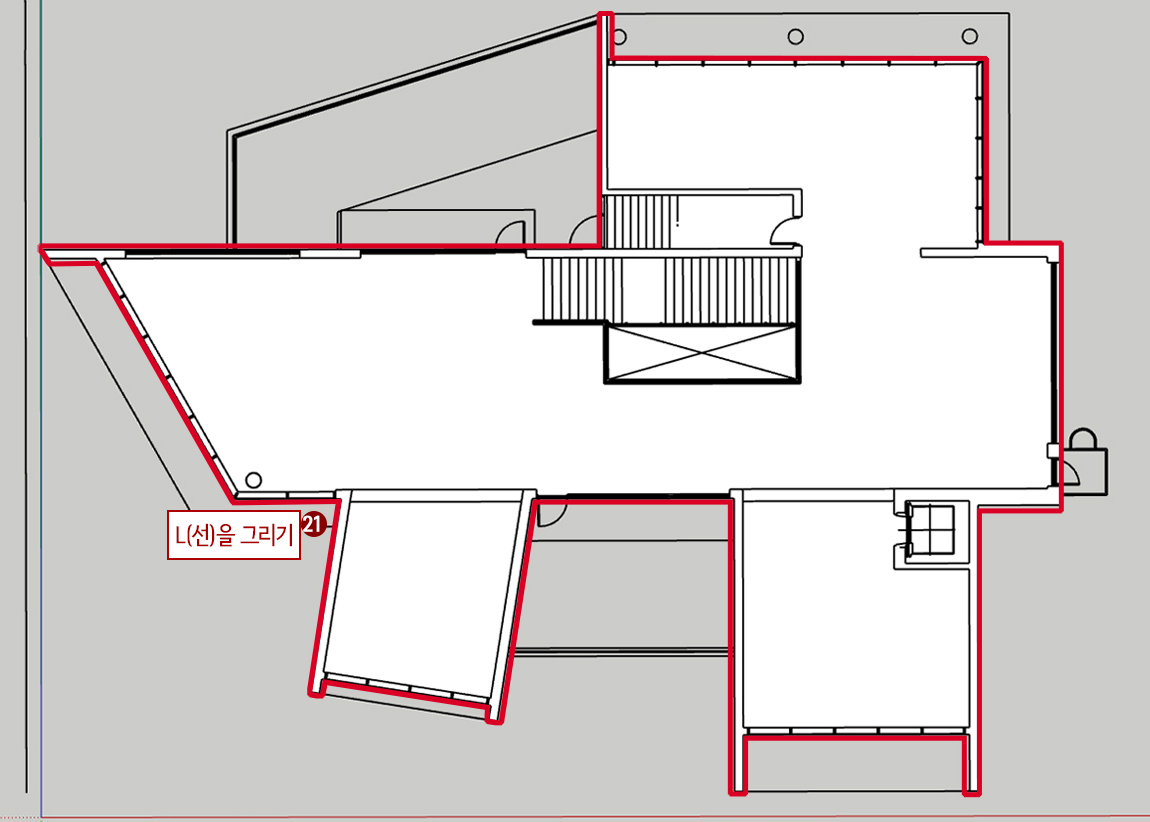 6. L(선)을 누른 후 외벽 선을 그려줍니다.(한 번에 다 그릴 필요는 없습니다.)