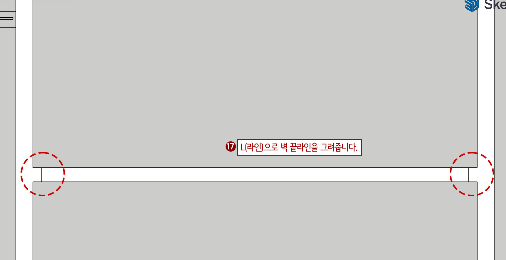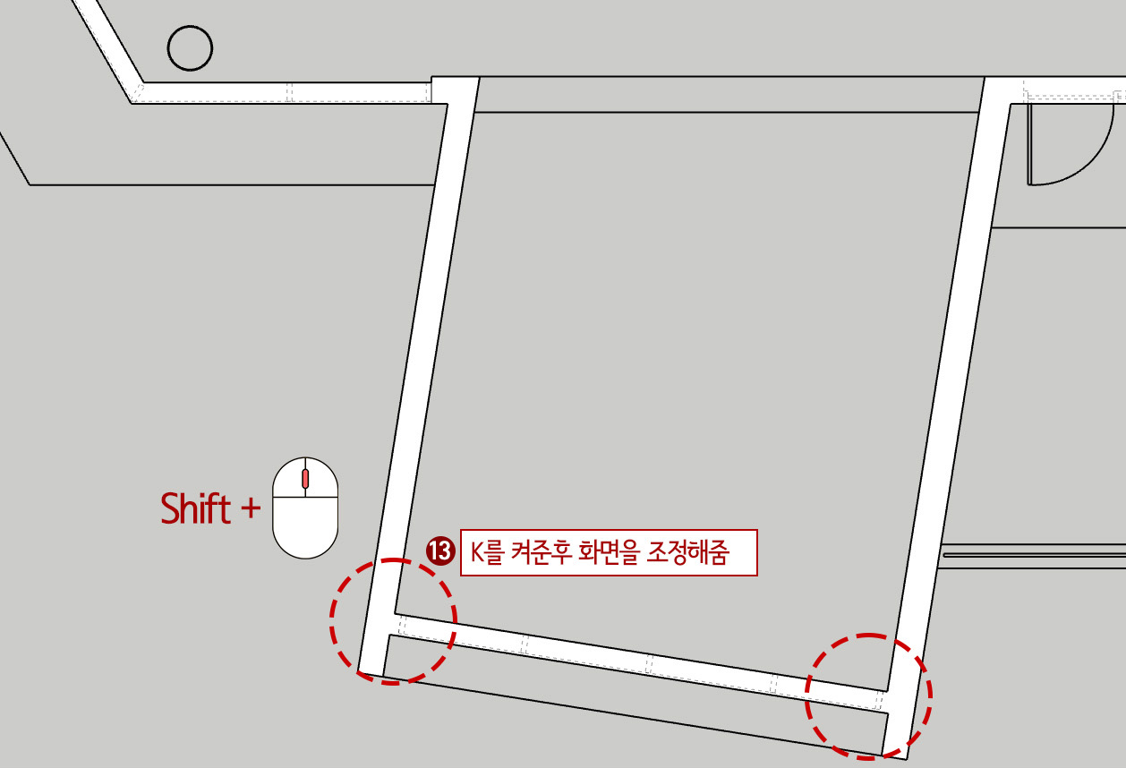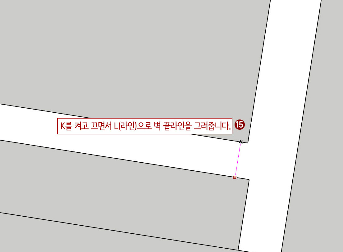 14. 점선 동그라미 부분을 확대한 후 L(선 그리기)을 누른 후 K를 켜고 끄면서 벽 끝라인을 그려줍니다.