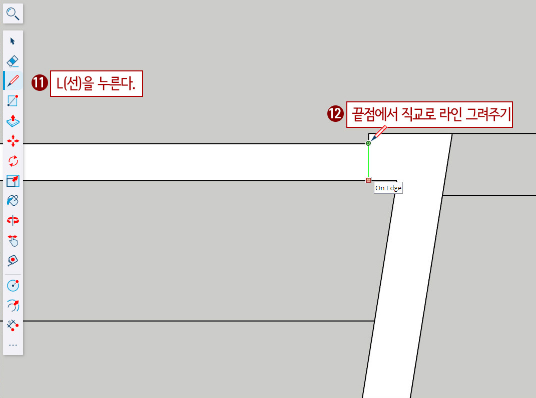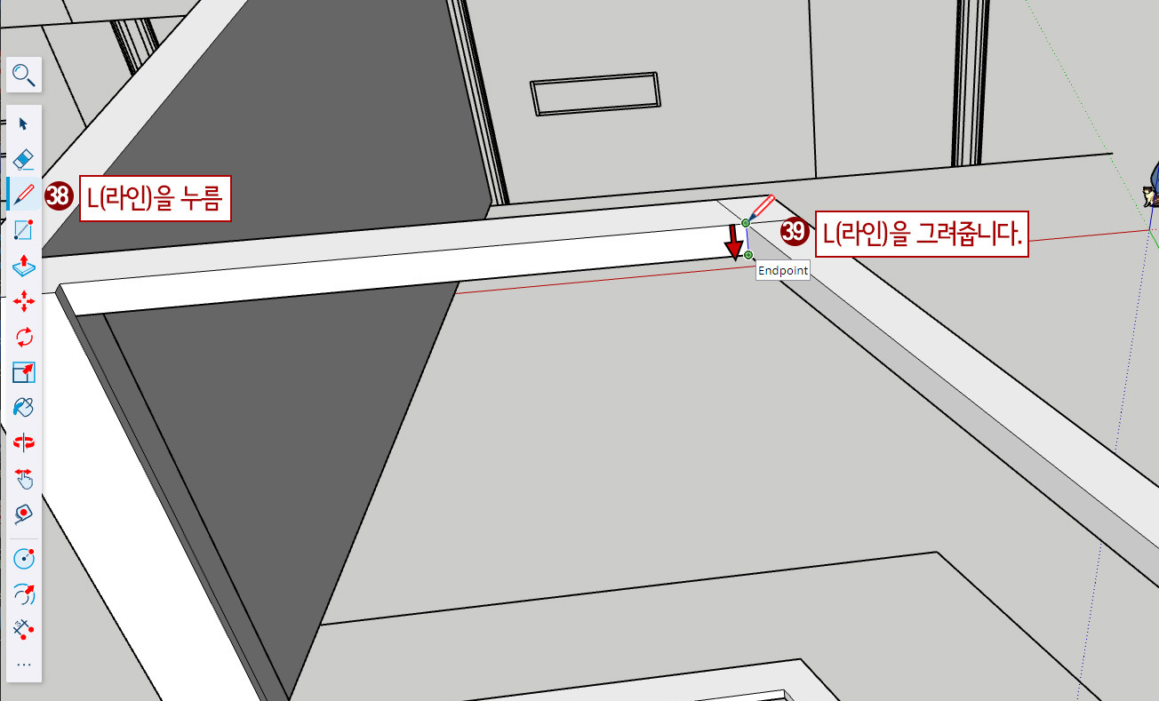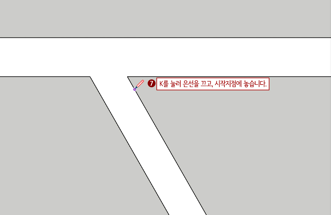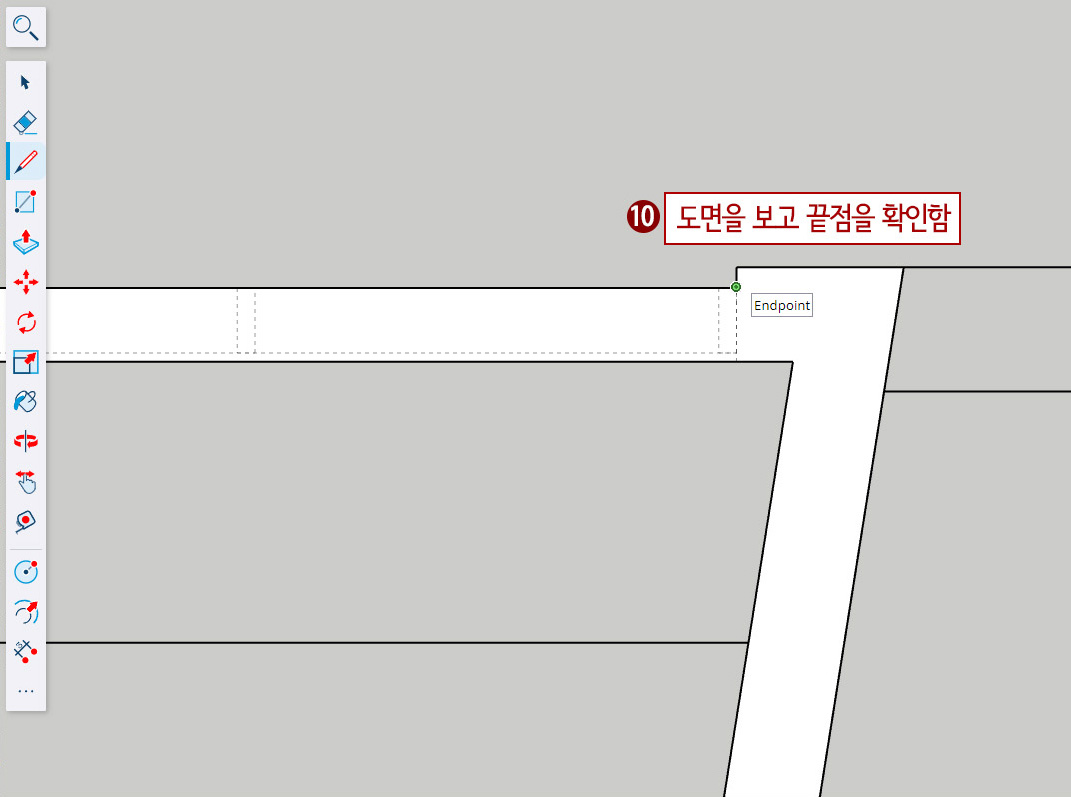 14. 점선 동그라미 부분을 확대한 후 L(선 그리기)을 누른 후 K를 켜고 끄면서 벽 끝라인을 그려줍니다.