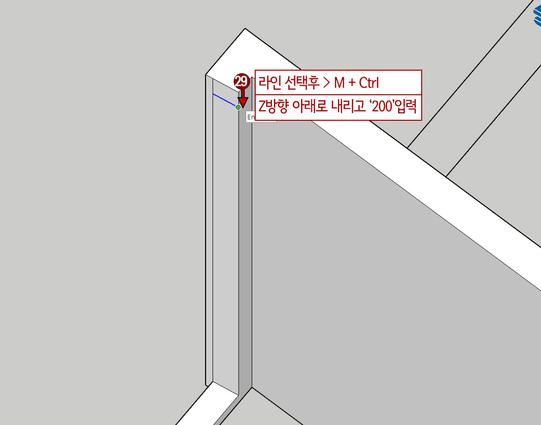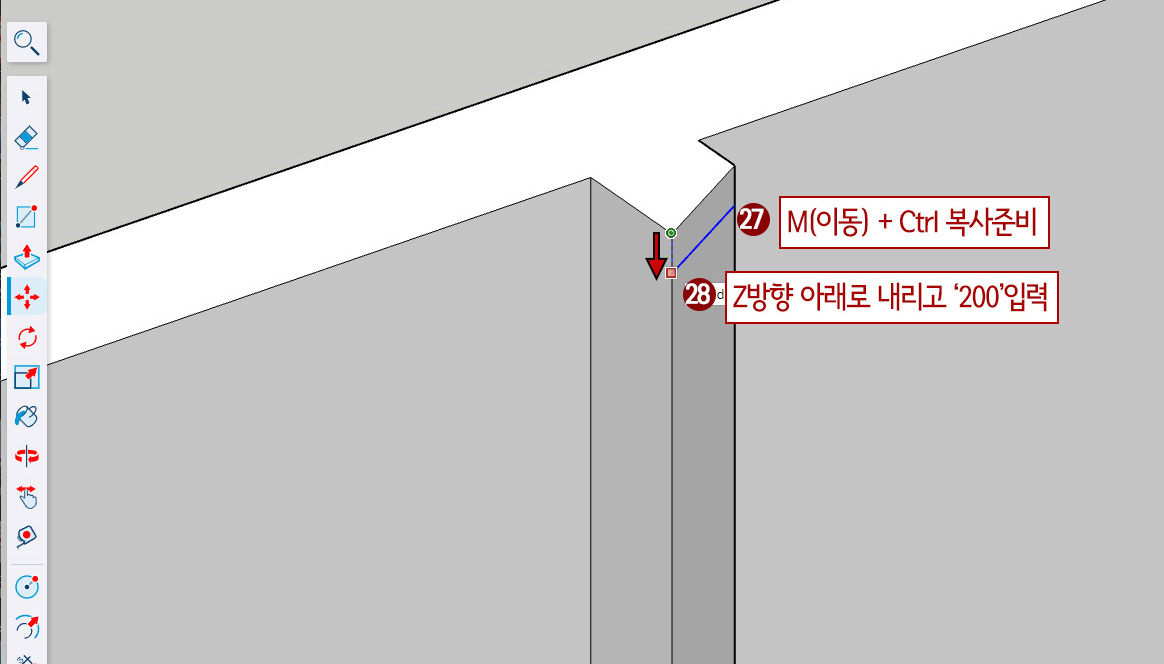 28. 키보드 ↑ 키를 눌러줍니다.(Z방향고정) 아래로 내리면서 키보드 '200'입력합니다.(아래도 200mm 복사)