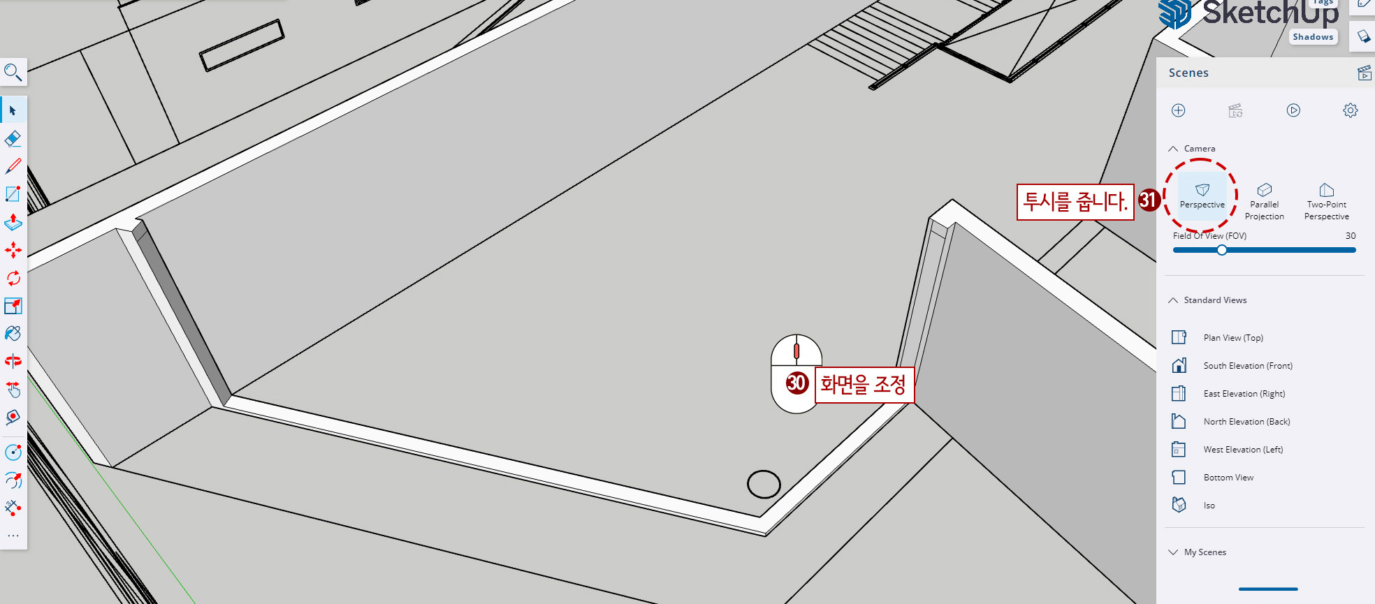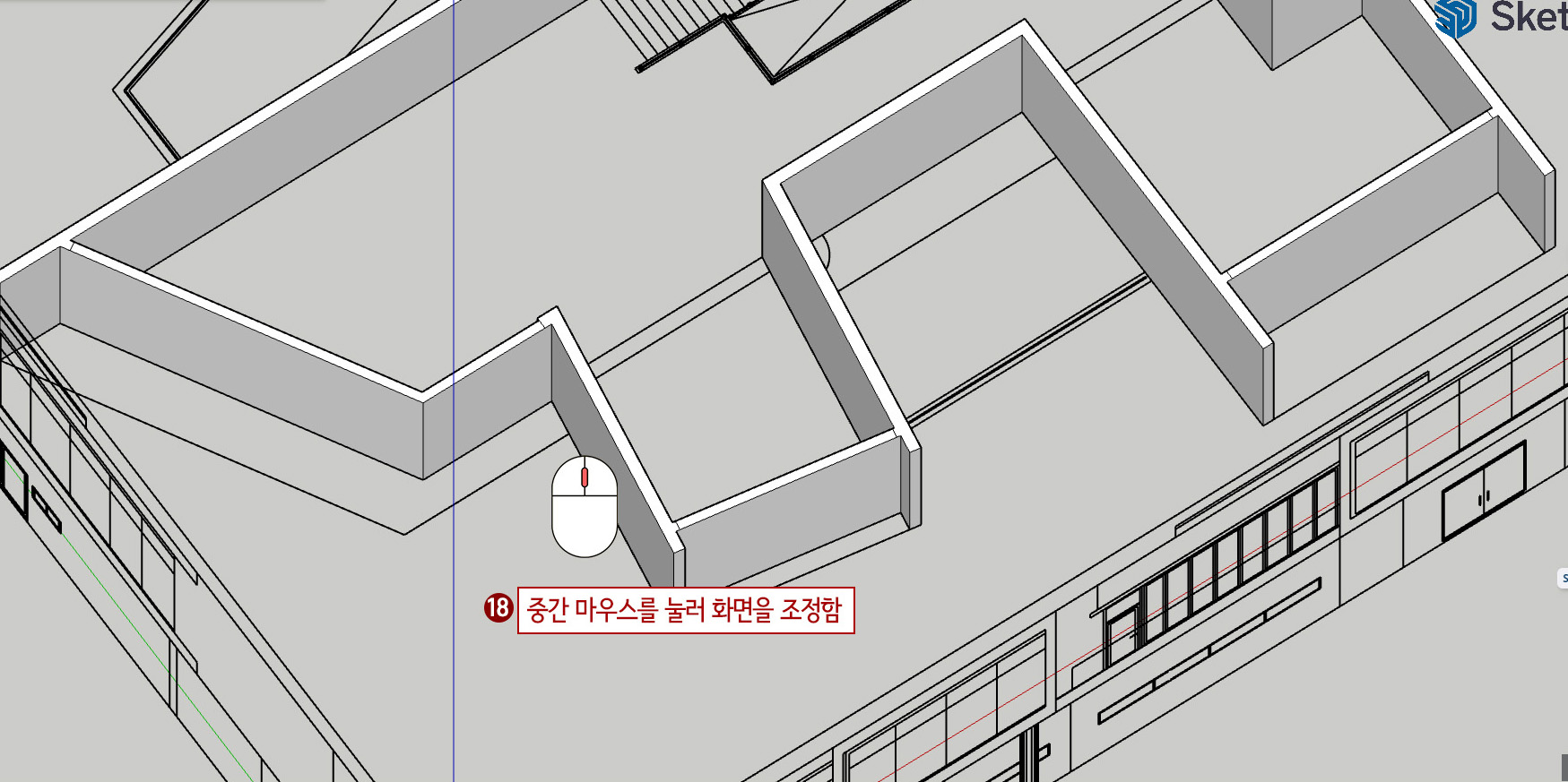18. 아래 그림처럼 화면을 조정해 준다. (벽체를 깎는 작업을 위해 입체로 볼 수 있도록 합니다.)