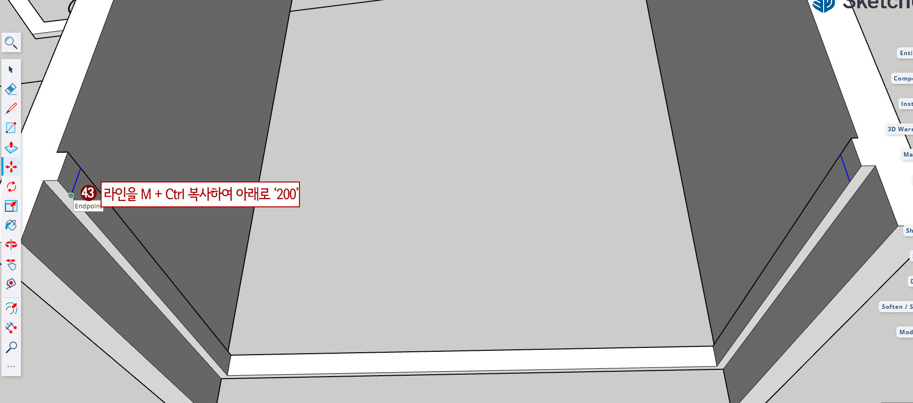 43. 위와 같은 방법으로 중간 창부분 상부 라인을 선택한 후 M + Ctrl 후 아래로 200 이동해 줍니다.