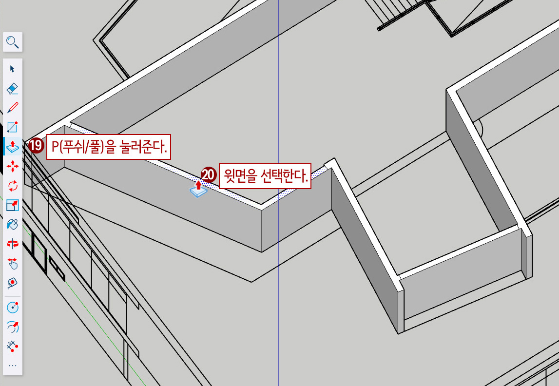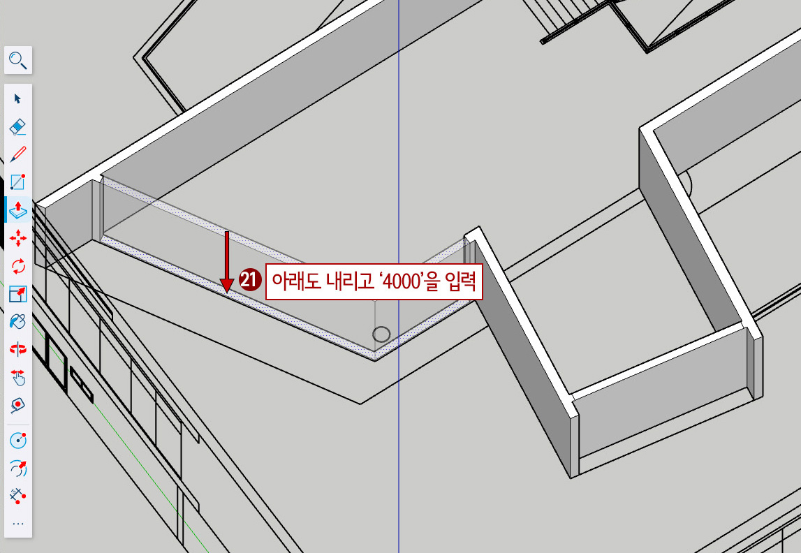 22. 기울어진 벽 윗면을 더블클릭합니다. (앞서했던 Push/Pull의 4000mm 내린 작업이 반복됩니다.)