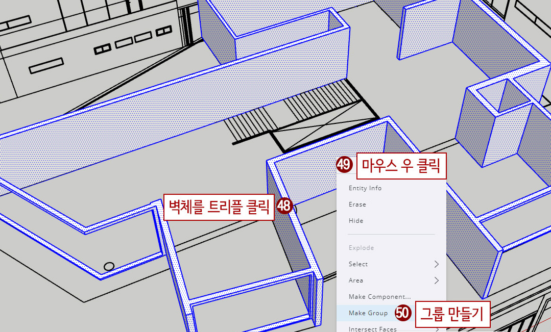 48. Space Bar(선택) 누른 후 벽체를 트리플 클릭합니다.