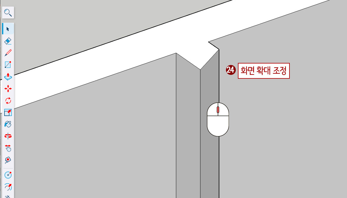 24. 사선벽 부분 왼쪽 측면을 볼 수 있도록 화면을 확대 조정합니다.
