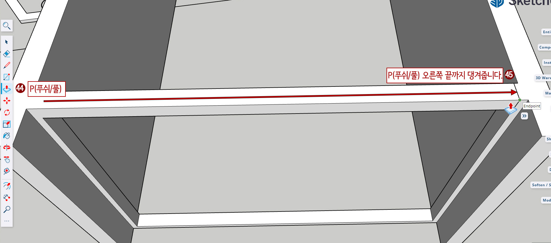 36. 반대편 튀어나온 윗면을 아래로 Push/ Pull 해줍니다.