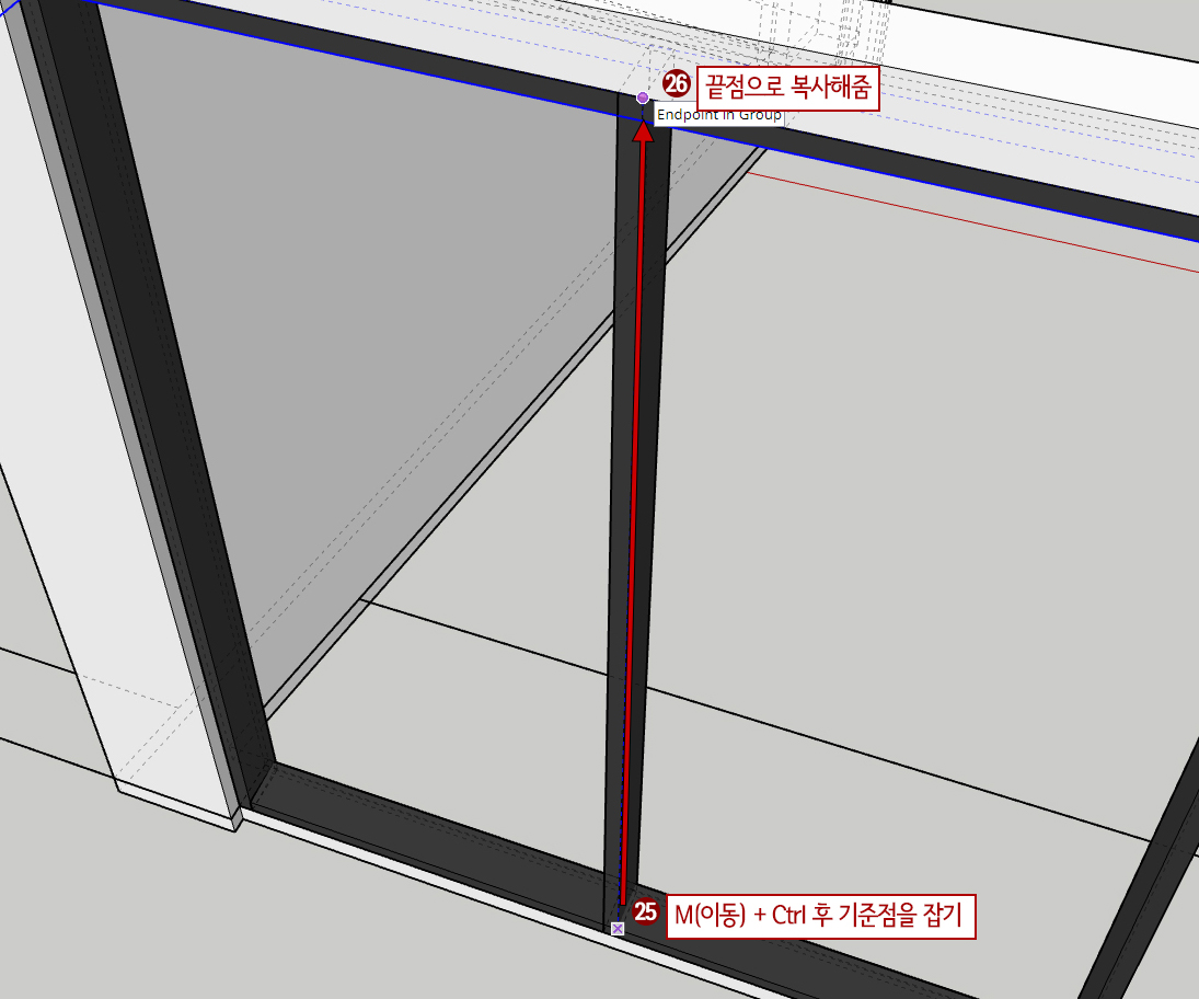 25. M(이동) + Ctrl를 누른 후 복사준비를 해줍니다. 수평과 수직프레임 교차점 상단을 기준점으로 잡아줍니다.
