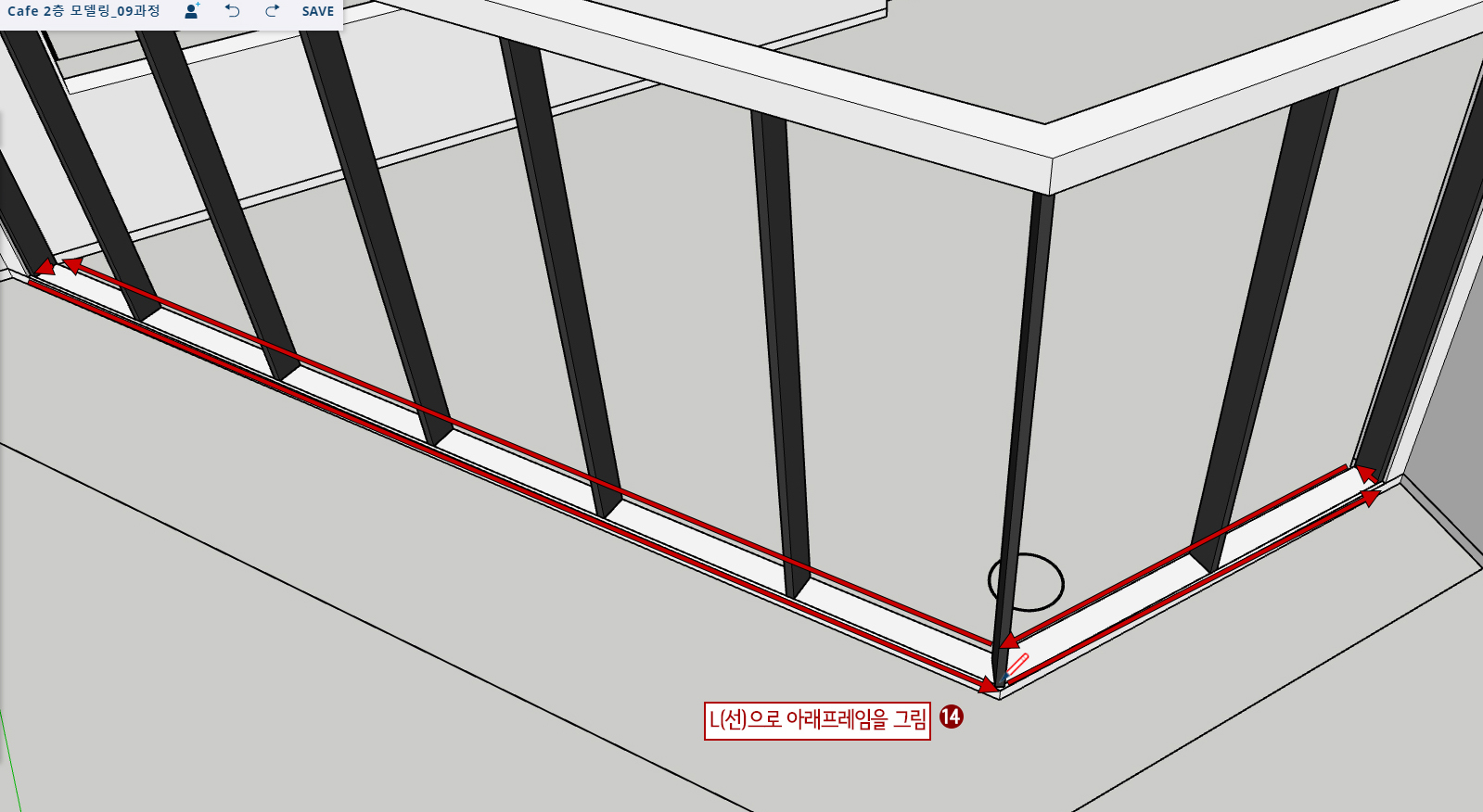 목차지난 챕터에 이어서 2층 테라스, 난간, 계단등을 만들어 봅시다. 지난 챕터 10까지 진행했던 파일 첨부합니다. 1. 테라스 난간 만들기1. 테라스 난간 부분을 화면 확대 조정을 합니다.2. L(선)