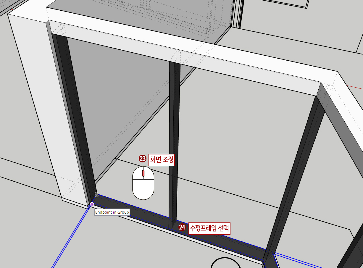16. 수평프레임 끝과 수직프레임이 겹쳐져 보일 것입니다. 이러면 렌더링 중에 멍든 것처럼 보인다던지 에러가 생길 수 있습니다. 그래서 수평프레임 앞면을 약간 밀어주는 것이 좋을 것입니다.(K를 눌러 은선이 보이도록 합니다.)