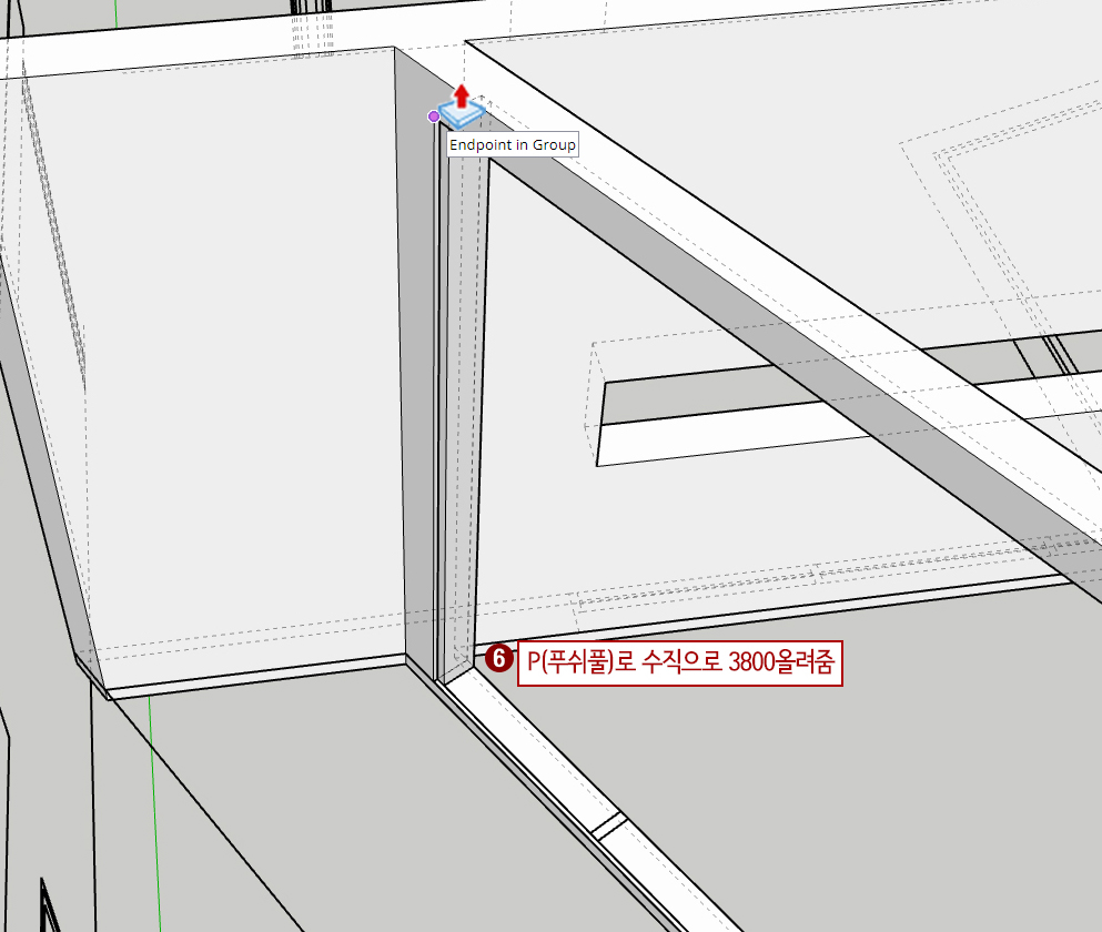 6. P(푸시풀)을 눌러 준 후 위로 당겨줍니다. 키보드로 '3800'입력해 줍니다. 트리플 클릭 후 그룹이나 컴포넌트를 시켜줍니다.