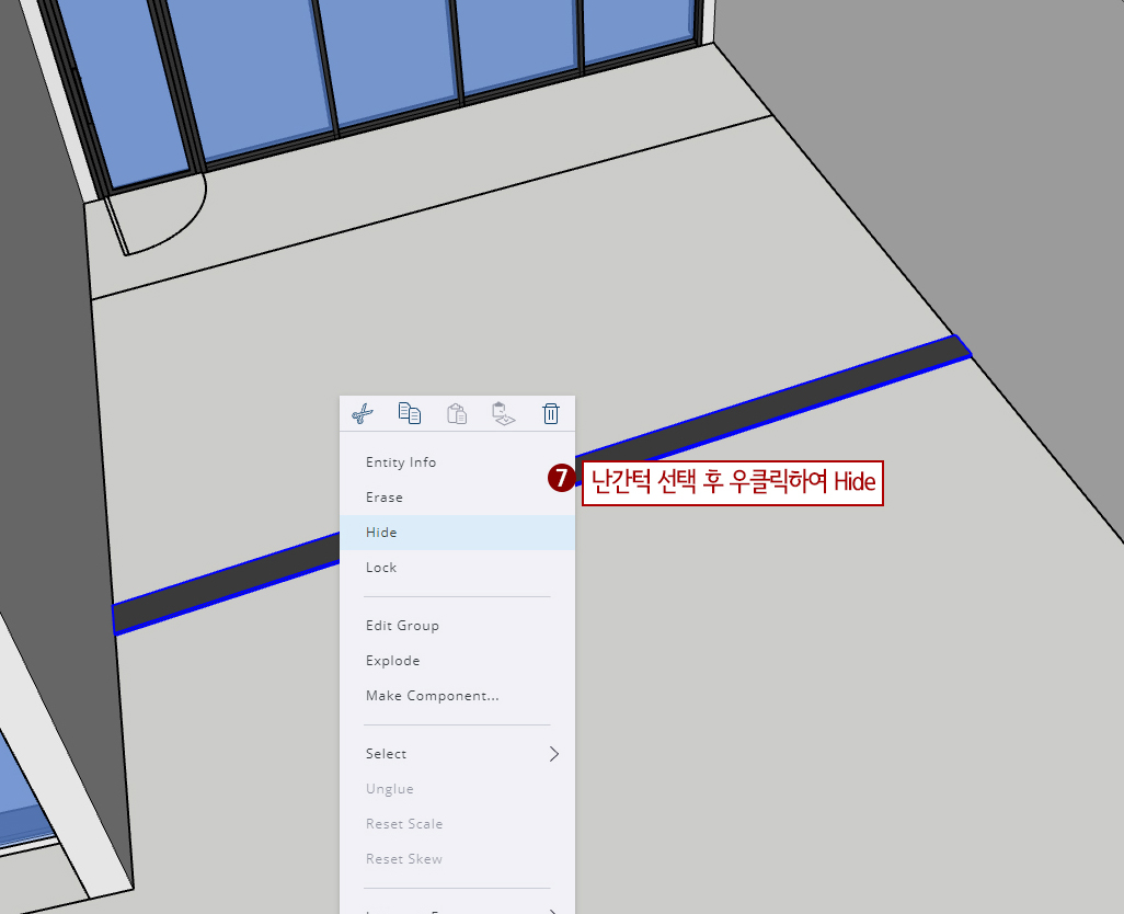 7. 테라스 난간턱 부분 물체 선택 후 우클릭하여 Hide(숨기기)하여 숨겨줍니다.