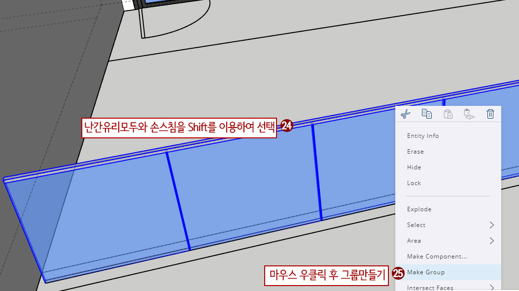 19. 난간 손스침을 트리플 클릭하여 선택하고 우클릭하여 그룹을 시켜줍니다.