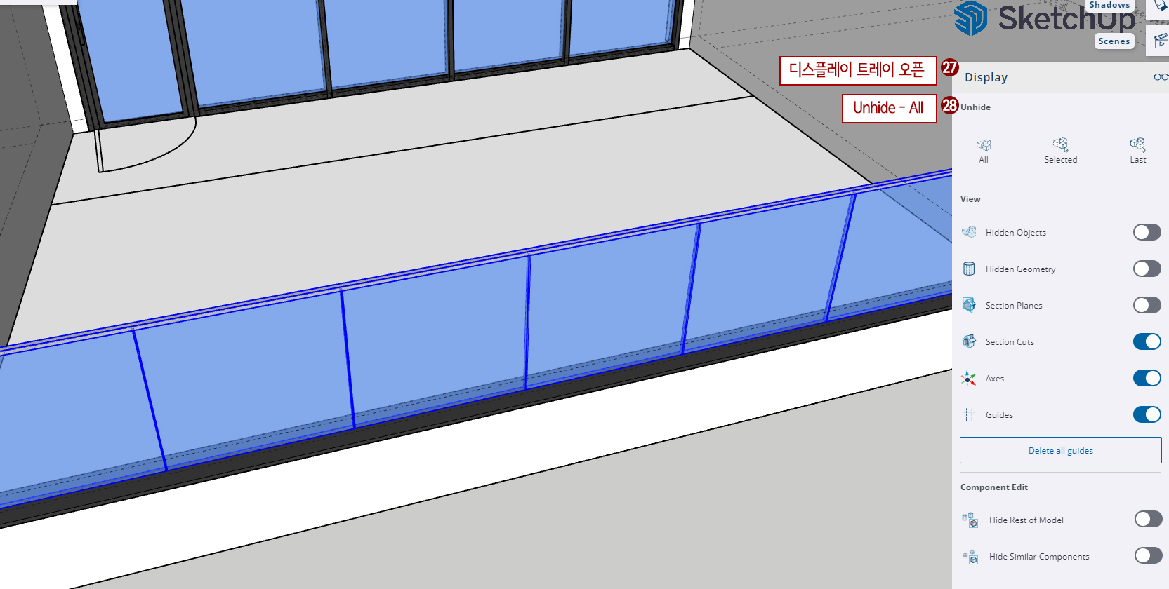 28. Unhide에서 All을 하여 숨겼던 물체를 나타냅니다.