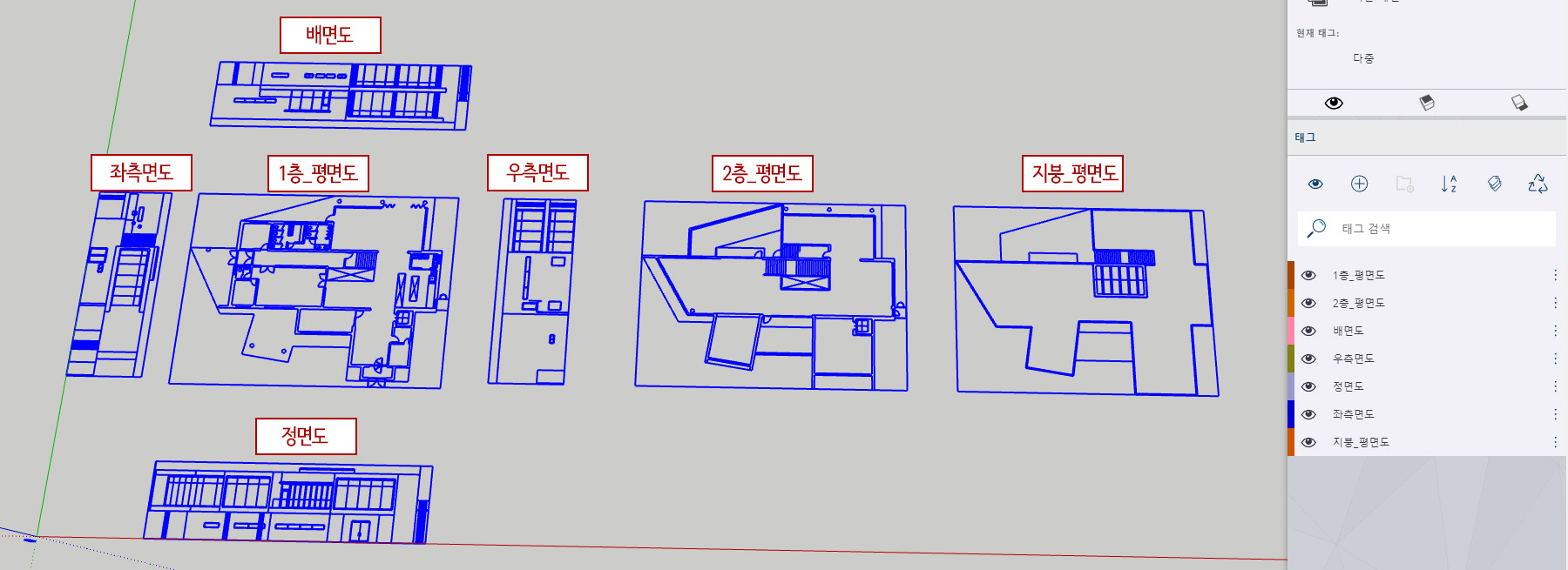 6. 나머지 도면도 아래 그림을 참조로 그룹(총7개 그룹) 시키고 태그를 지정해 준다.