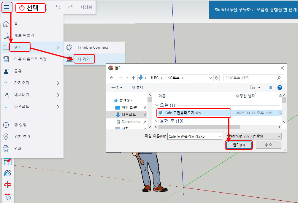1. 아래 파일(Cafe도면 불러오기. skp)을 다운로드하여서 내 컴퓨터에 저장하고
