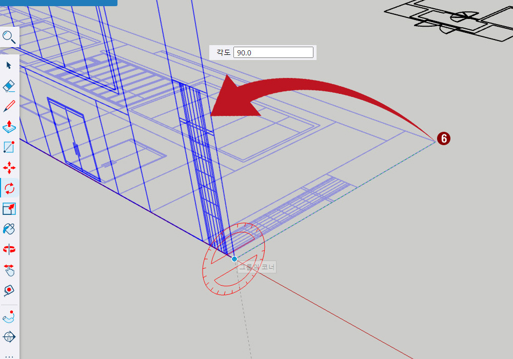 6. 90도가 될 수 있게 왼쪽 위쪽으로 돌려줍니다. (스냅이 걸려서 자동으로 90도가 될 겁니다. 아니면 그냥 "90"를 키보드로 입력하면 자동으로 90도로 세워질 것입니다.
