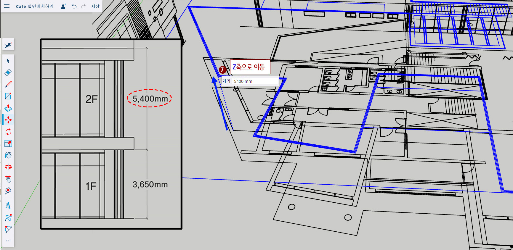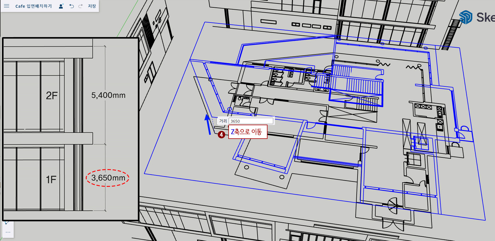 4. 본 건축물의 1층 층고는 3,650mm입니다. 따라서 이동 시킨 "2층_평면도"도면을 선택한 후 Z(수직) 방향으로 마우스를 올려주고(이때 단축키 ↑ 를 입력하면 Z방향으로 고정됩니다.) 키보드에서 "3650"을 그냥 입력합니다.