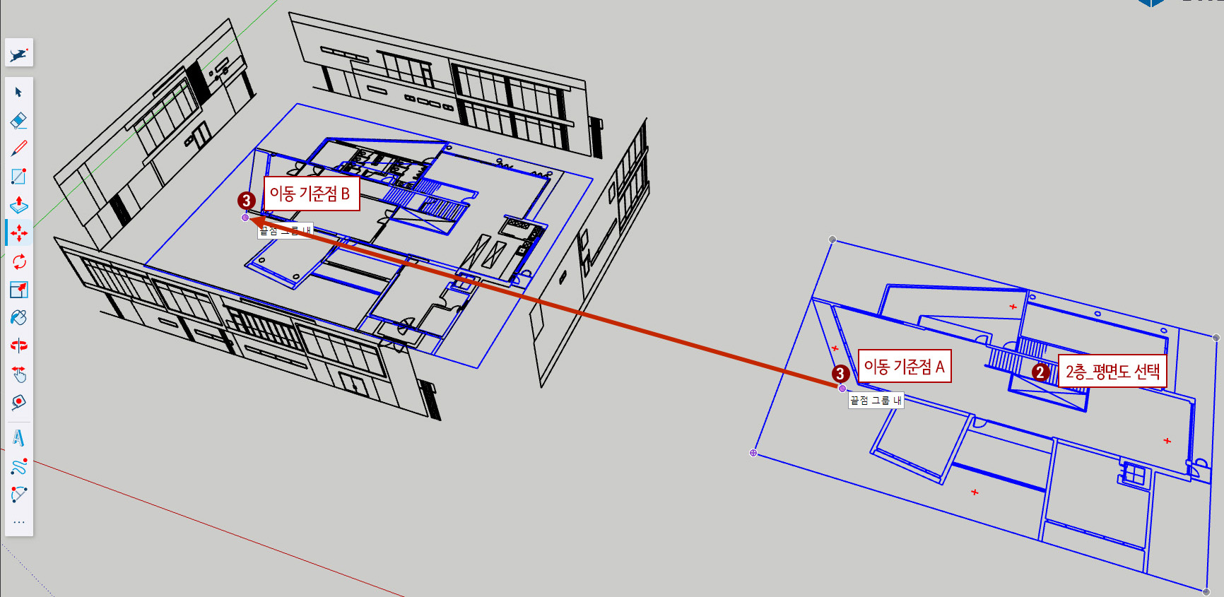 3. M(이동 단축키)을 눌러주고 이동 기준점 A부분을 잡아서 이동 기준점 B부분(A와 B는 도면을 보면 1층 천정 부분 외곽 모서리 부분입니다.)으로 이동시켜서 포개어 줍니다.
