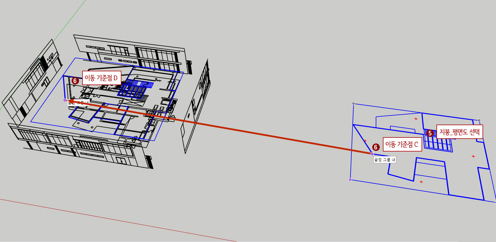 6. M(이동 단축키)을 눌러주고 이동 기준점 C부분을 잡아서 이동 기준점 D부분으로 이동시켜서 포개어 줍니다.(D 지점은 2층_평면도 천정부분 외곽 모서리 부분입니다.)