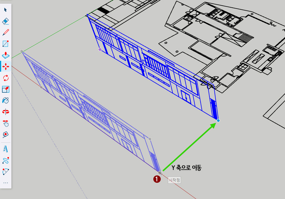 90도로 세워진 정면도를 평면도 근처로 이동할 것입니다. 정확히 얼마의 간격으로 배치한다고는 말할 수 없지만 평면도 앞부분에 이동할 것입니다. 하지만 이동 방향은 Y축으로 이동해야만 합니다.