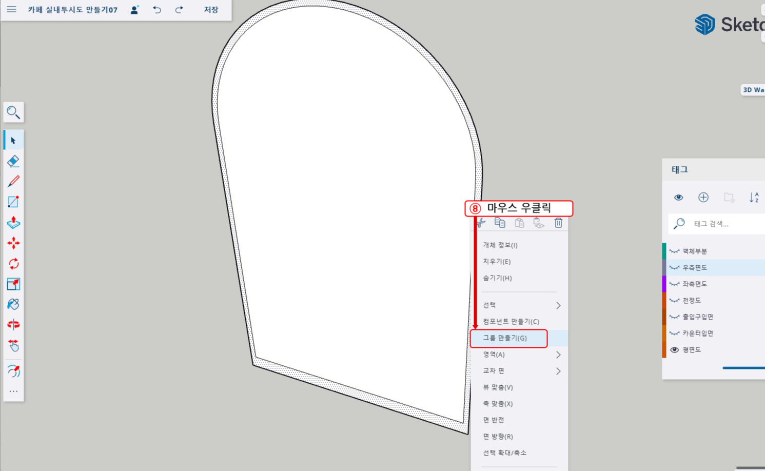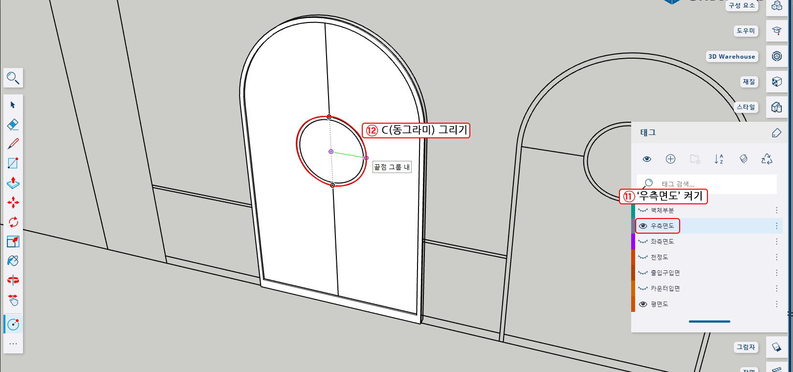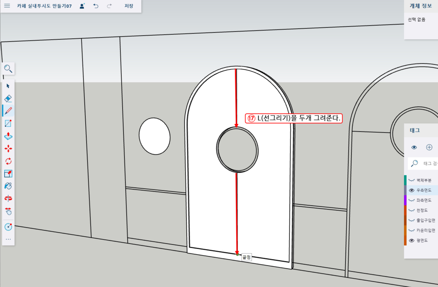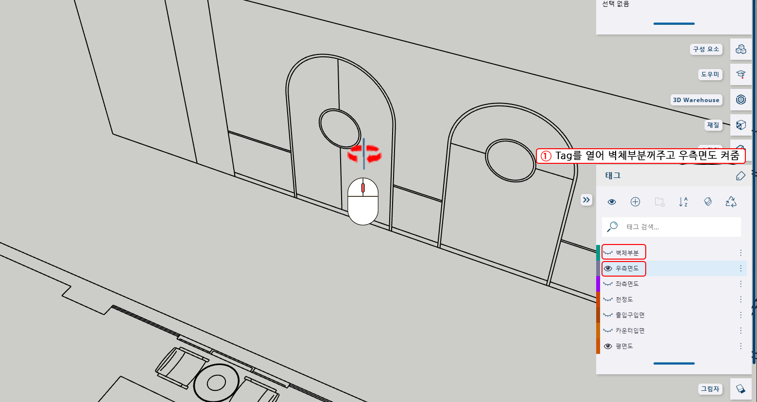 1. 우측에 태그 트레이를 열어서 '우측면도'태그를 켜주고 '벽체 부분'은 꺼준다. 그리고 화면을 조정해 준다.
