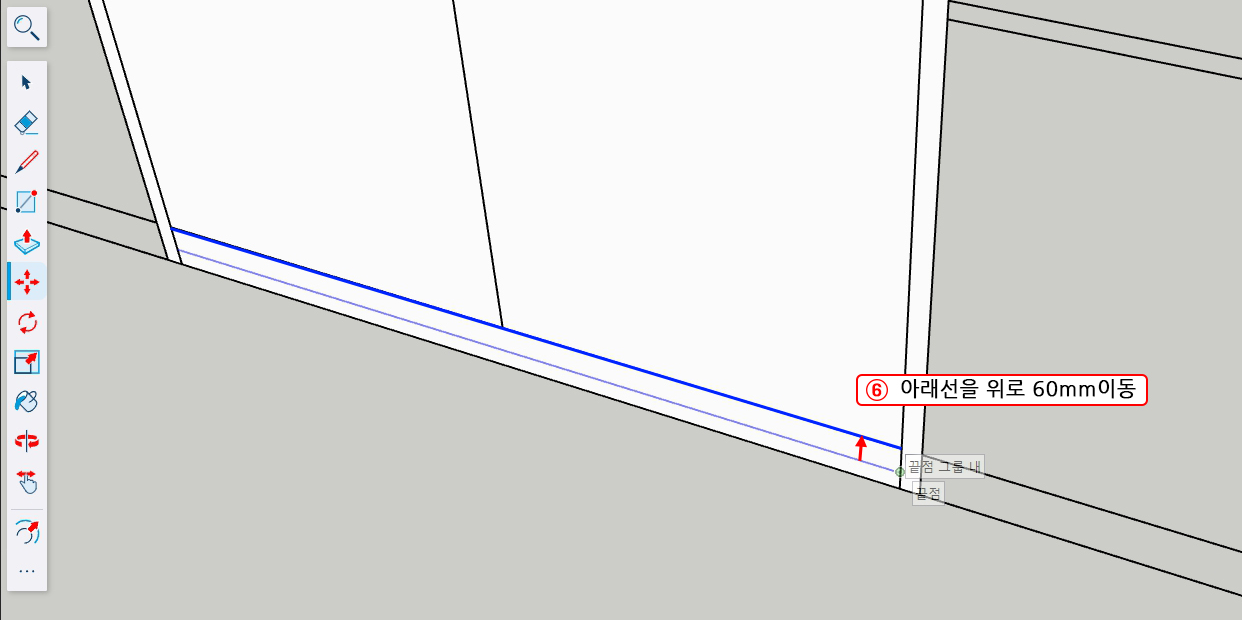 6. 아래 선을 선택한 후 위로(Z 축) M(이동)을 60mm 해준다.