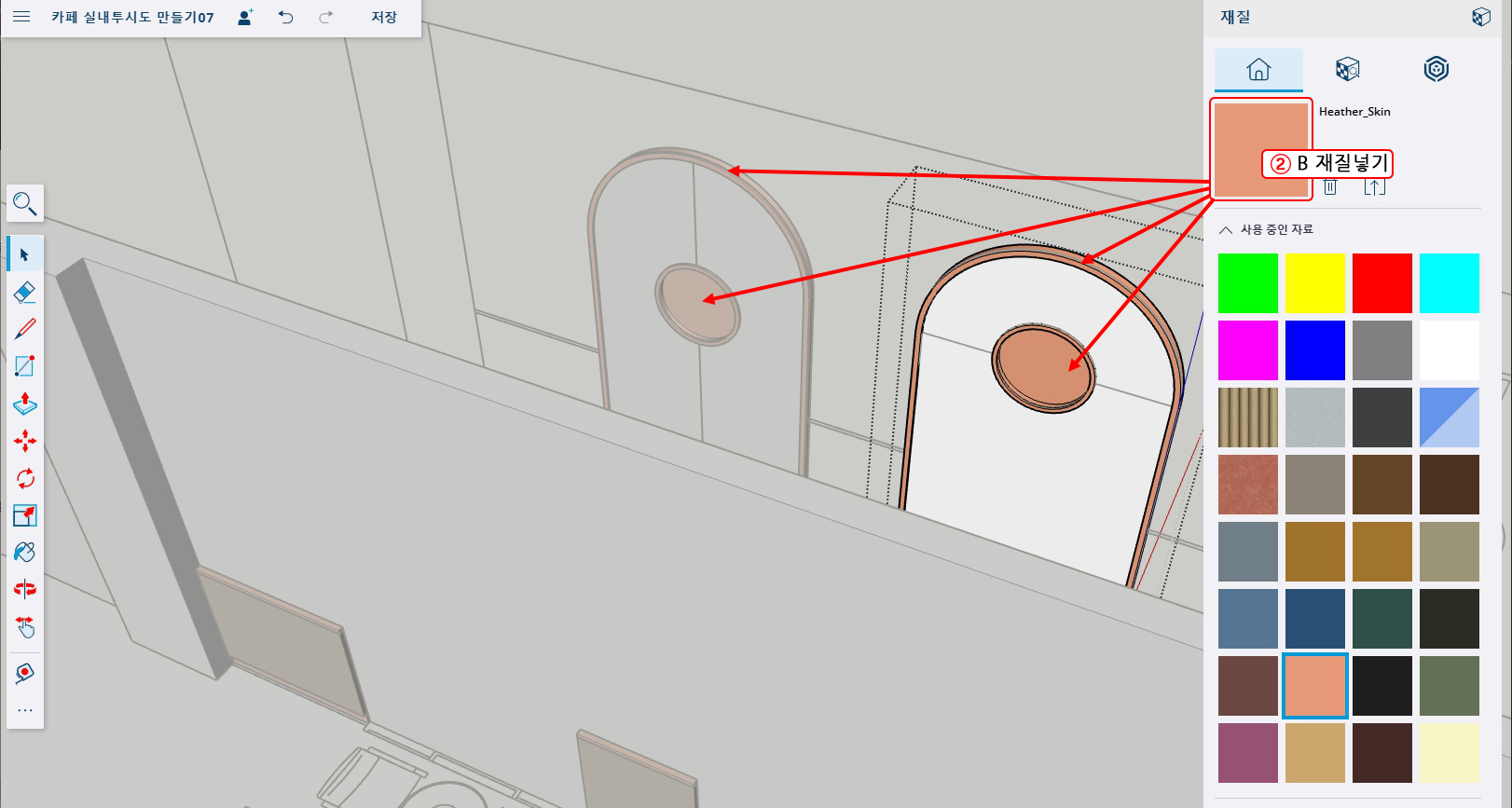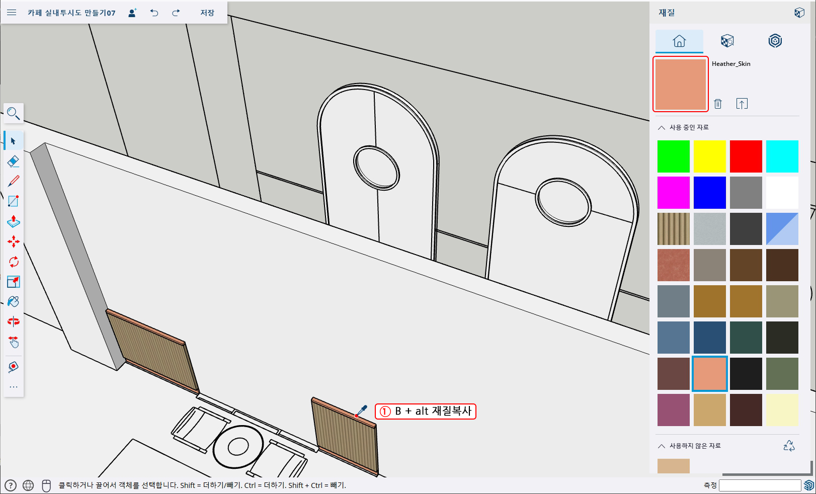※ 우측에 태그 트레이에서 '벽체 부분' 태그를 켜준다. 기존에 물체에서 재질을 복사하기 위해서입니다.