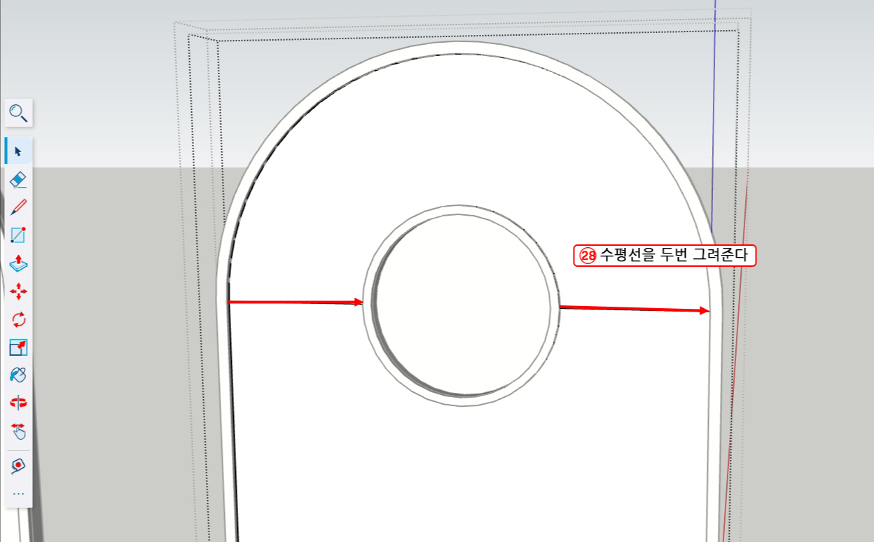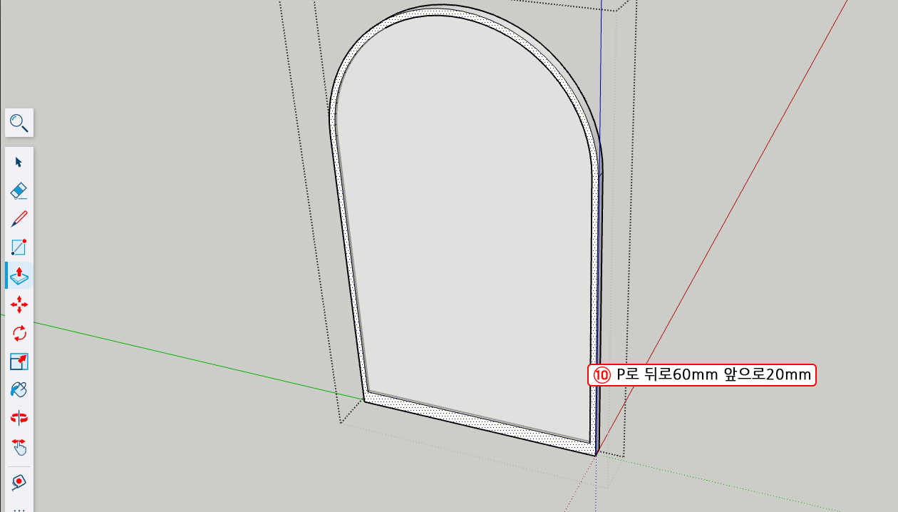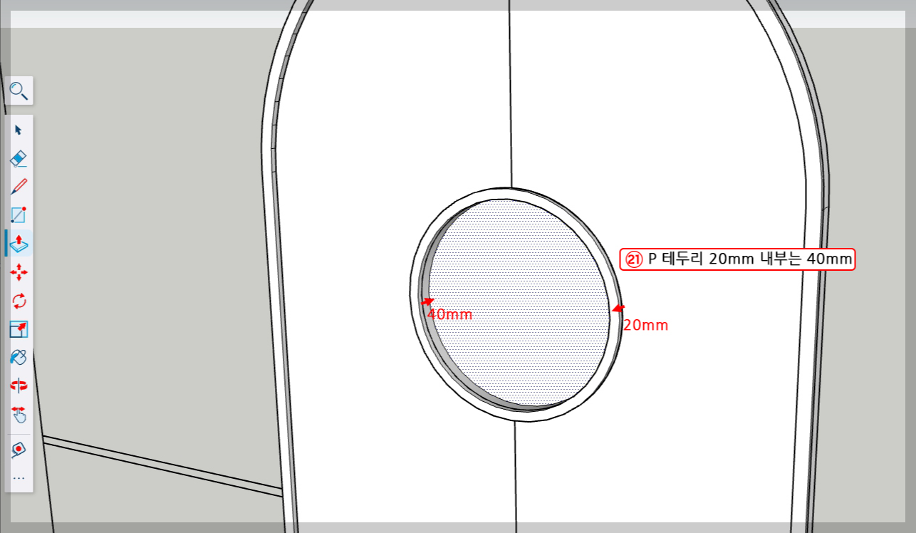 21. P를 누른 후 테두리는 앞으로 20mm 댕겨주고 중간동그라미 면을 뒤로 40mm 밀어준다.