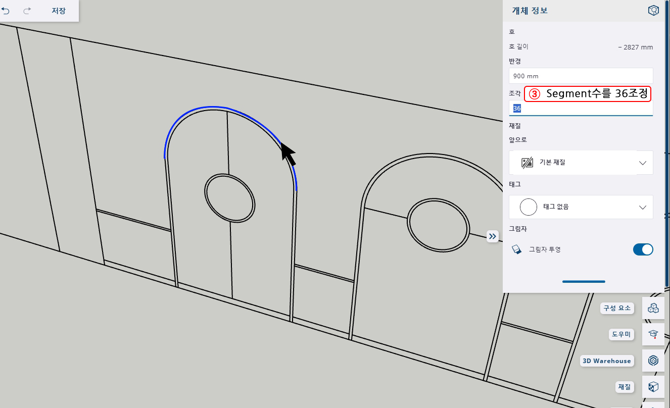 3. 호를 선택 후 개케 정보(Entity Info)에서 Segement(조각) 값을 '36'으로 고쳐준다.