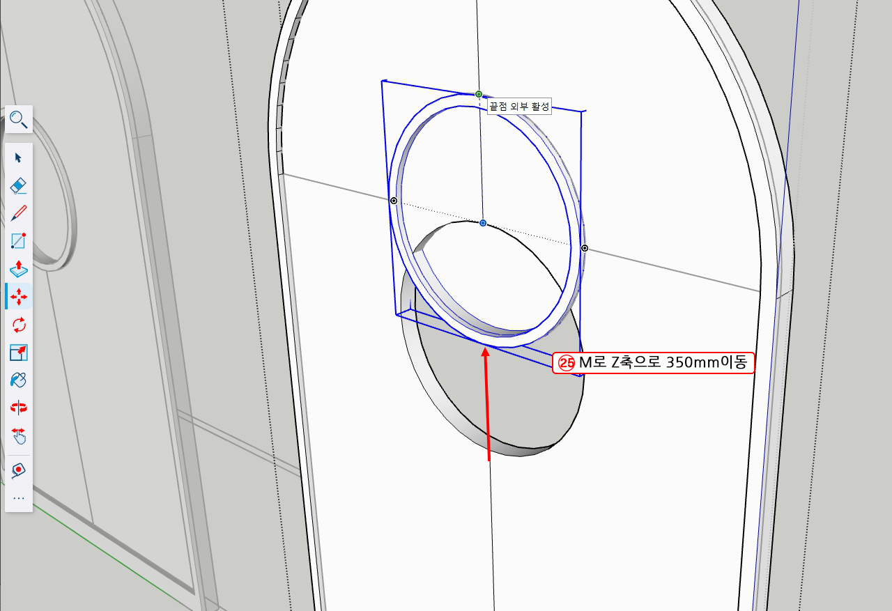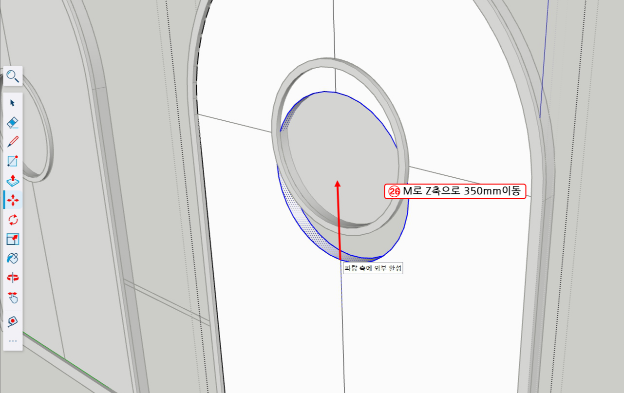 26. 중간면을 더블클릭한 후 동그라미 테두리면을 선택하여 위로(Z축방향)로 350mm 이동시켜 준다.