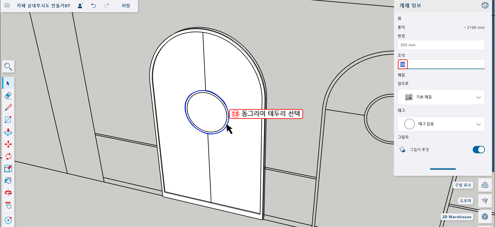 13. 동그라미 테두리를 선택한 후 개체정보(Entity Info)에서 조각(Segment)을 '36'로 조절한다.