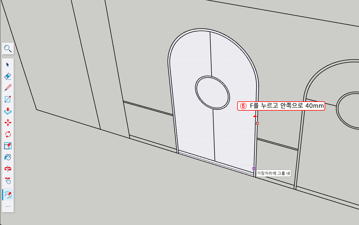 5. F(Offset)을 누른 후 내부면을 클릭 후 안쪽으로 40mm 넣어준다. (스냅이 걸릴 것이다.)