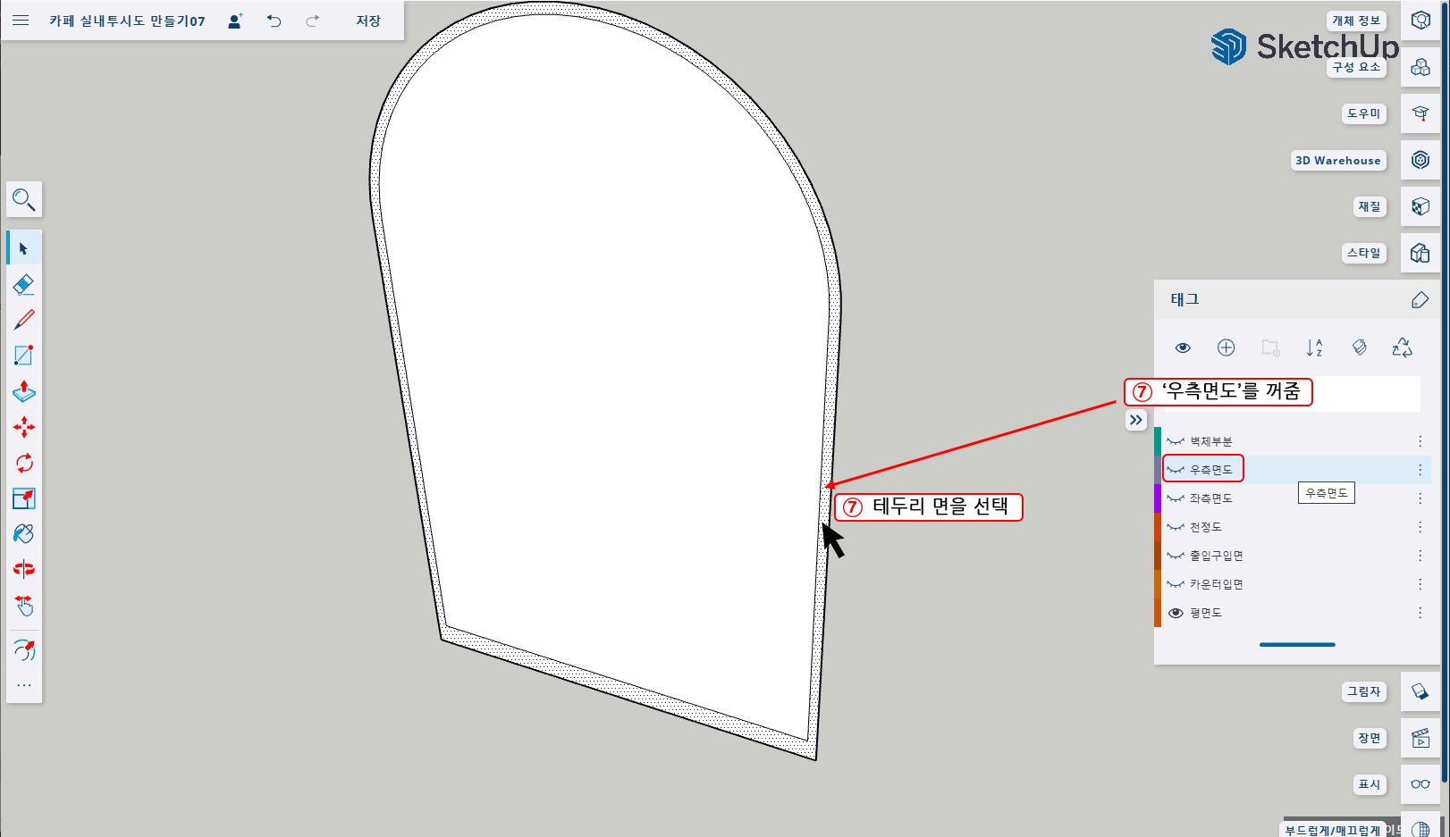 7. 태그를 열고 '우측면도'를 꺼준다음 테두리면을 선택해 준다.